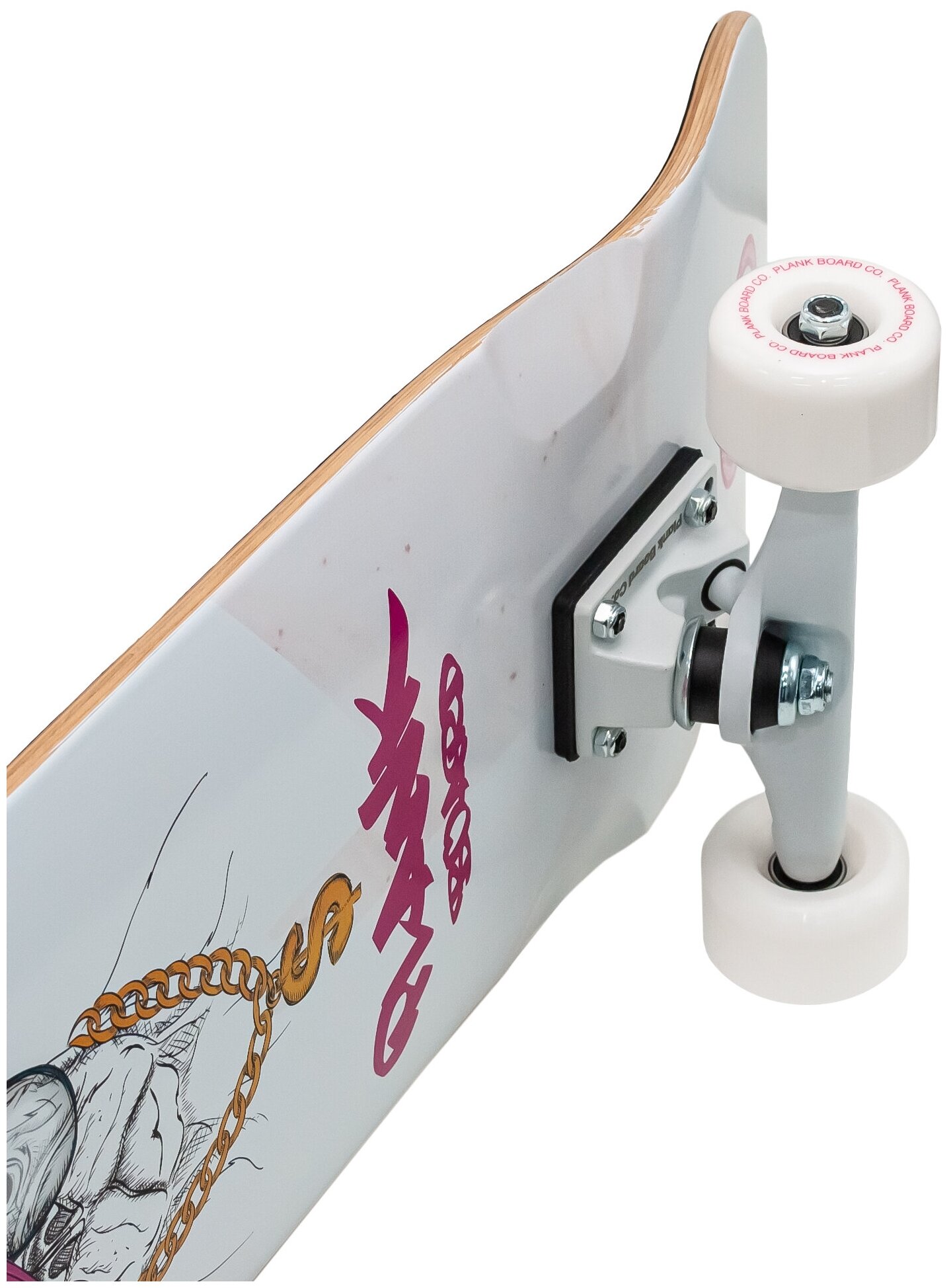 Материал деки состоит из 7 слоев канадского клена. Классические алюминиевые 6-ти дюймовые подвески сжесткостью бушингов SHR90A гармонично сочетаются с колёсами диаметром 60х40 мм. средней жесткости SHR78А с надежными и плавными подшипниками АВЕС-7 из хромированной стали.