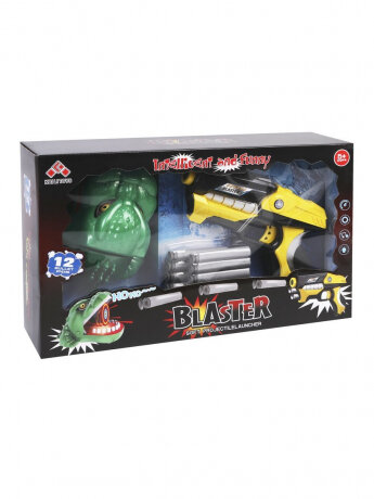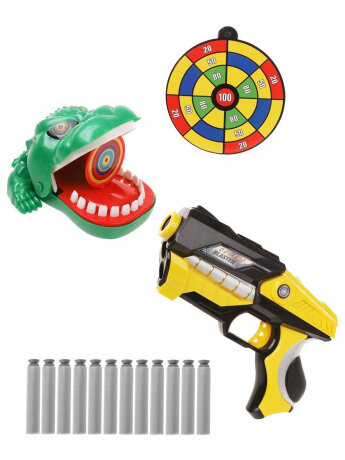 В комплекте: бластер – 1 шт., мягкие пули (12 шт.), классическая мишень (из картона) – 1 шт., мишень в виде пасти животного – 1 шт.