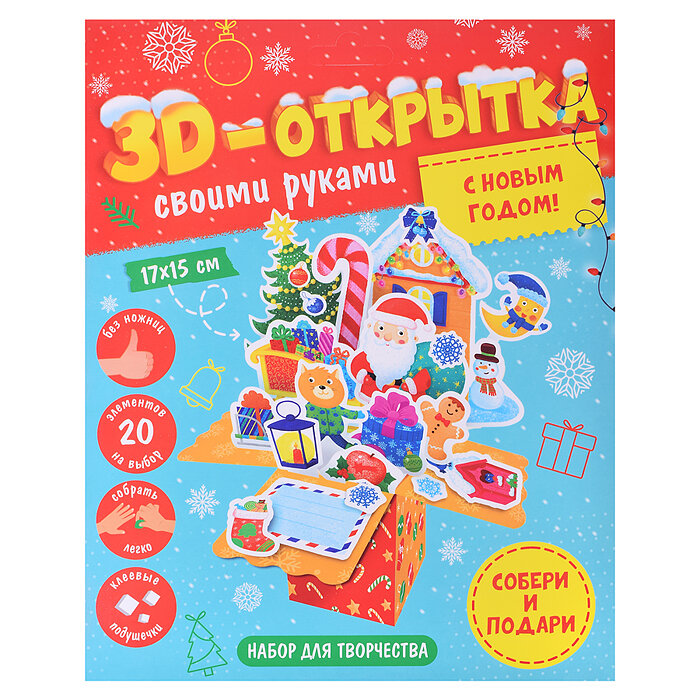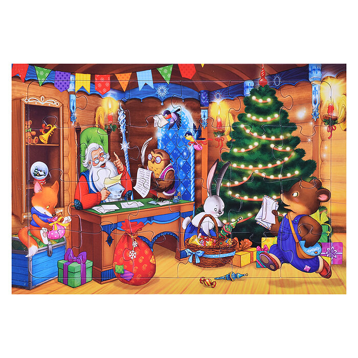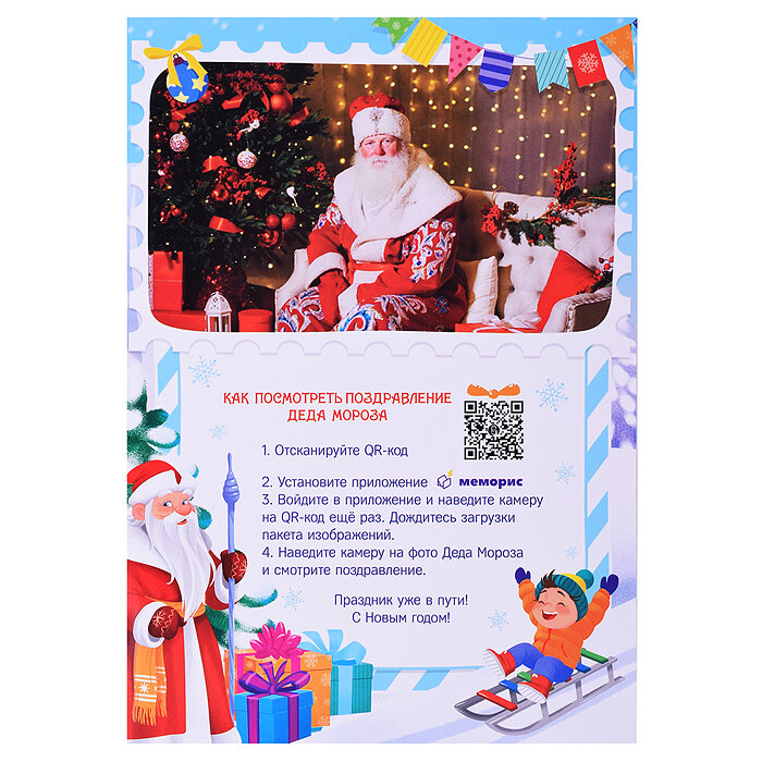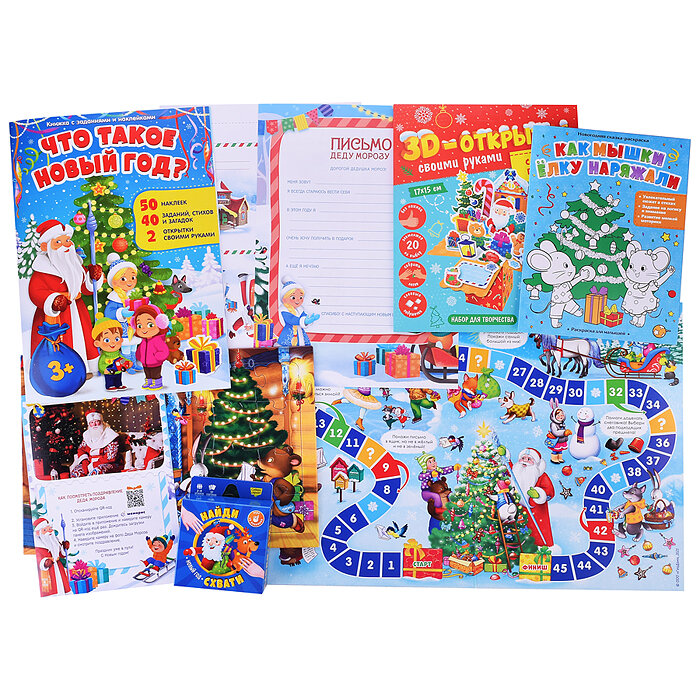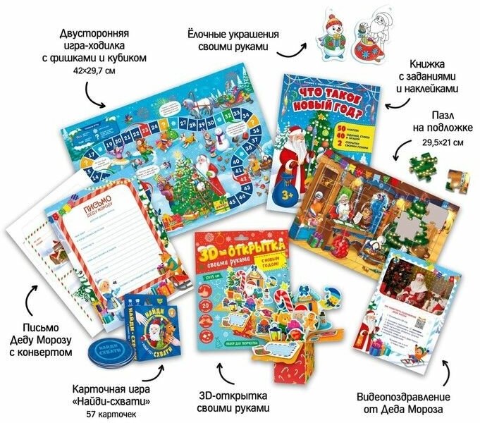 | Комплектация | наклейки; настольная игра; открытка; видеопоздравление; елочное украшение; пазл; письмо |