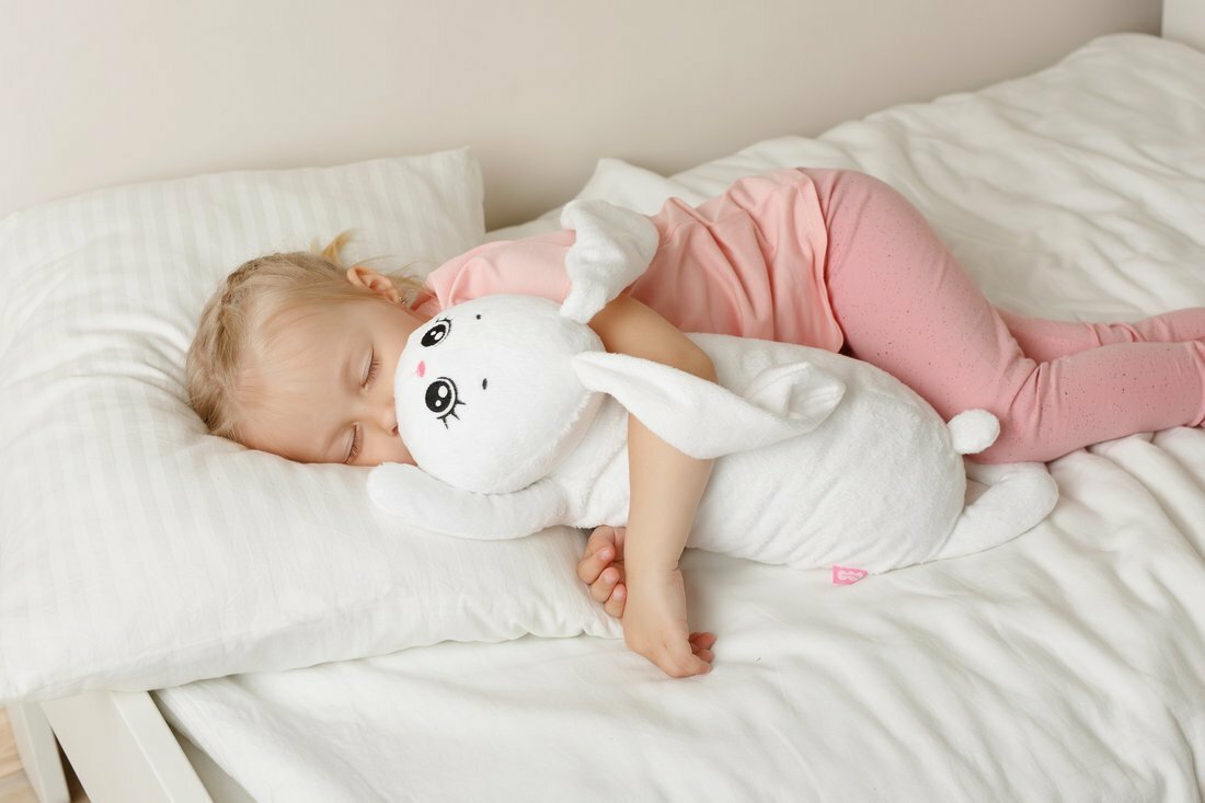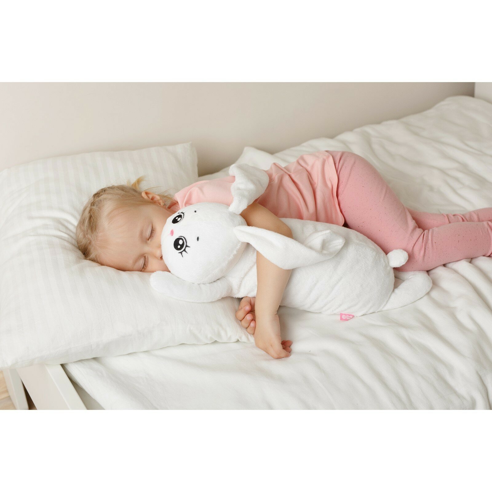 Вытянутая форма игрушки идеально подходит для совместного сна. За счет современного дизайна и нейтральных оттенков зайки, ее можно использовать в качестве диванной игрушки подушки, которая украсит интерьер детской комнаты.