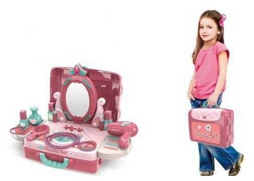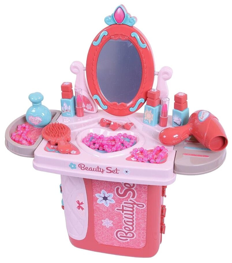 Комплектация набора: чемоданчик - 1 шт, навесные полки - 2 шт, столешница - 1 шт, зеркало (пластик) - 1 шт, фен - 1 шт, расческа - 1 шт, косметические флакончики - 4 шт, игрушечная помада - 2 шт, колечки - 3 шт, бусы - 2 шт, браслеты - 2 шт.