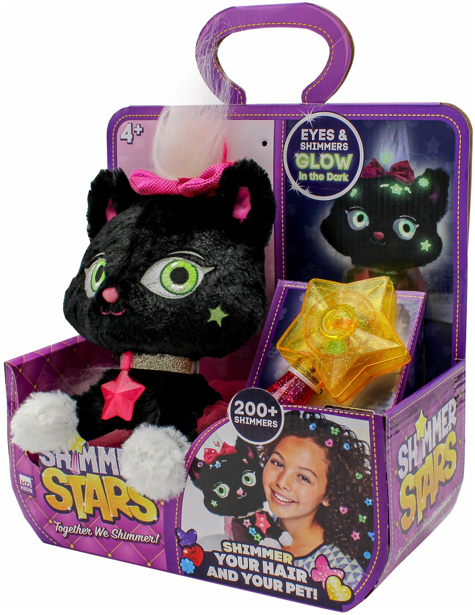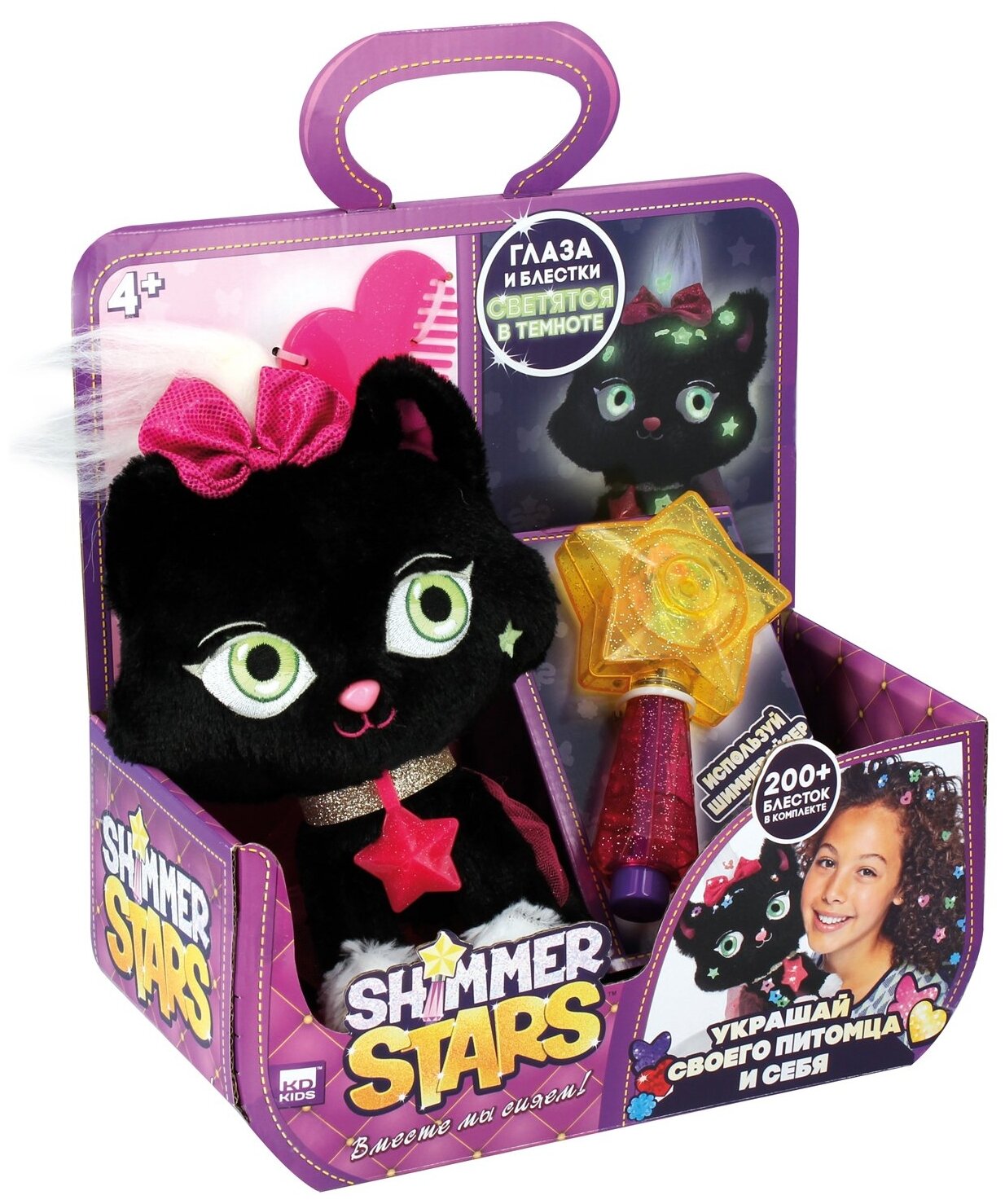 Комплект: плюшевый черный котенок, шиммерайзер (аксессуар для хранения и нанесения блесток), 200+ блесток (светятся в темноте), расческа.