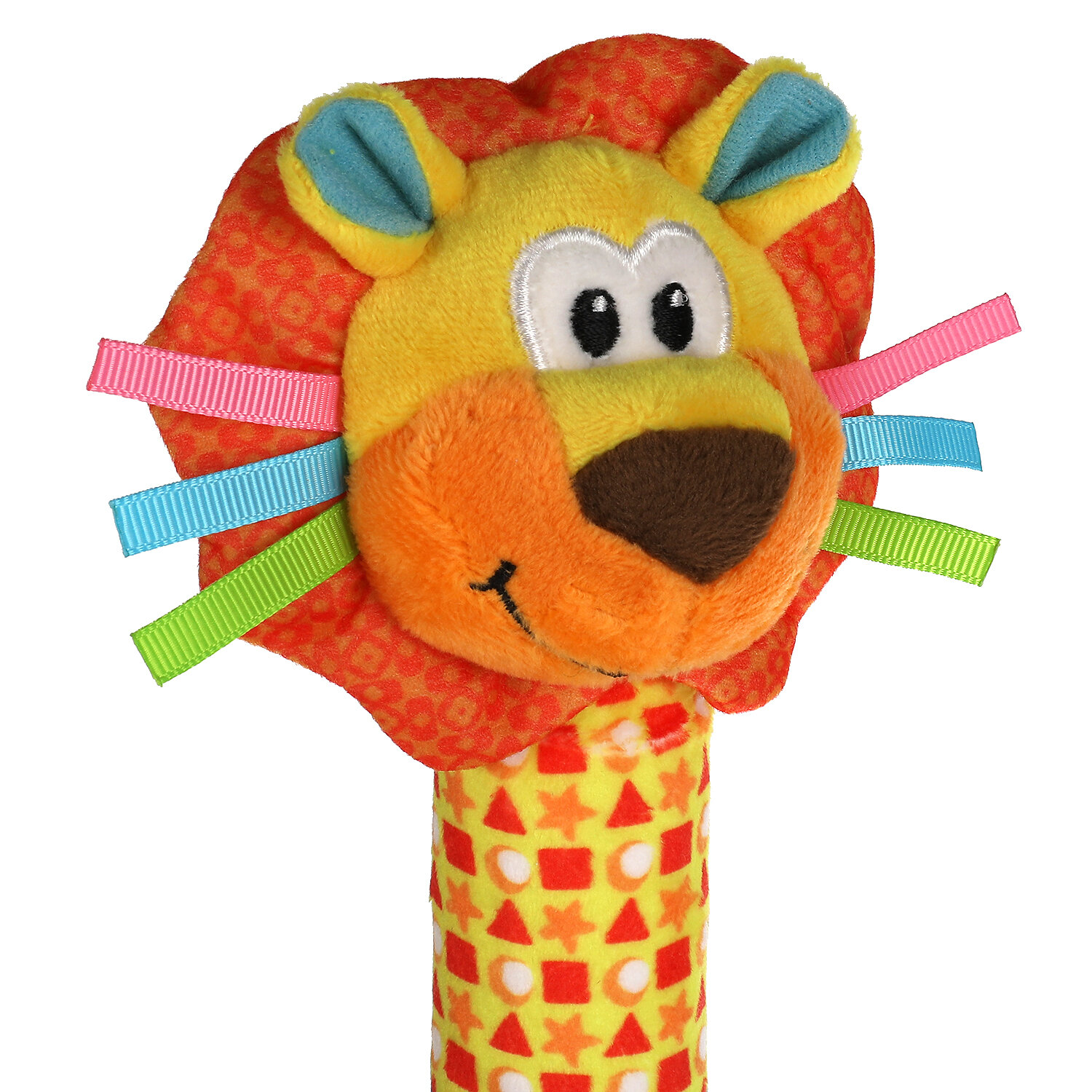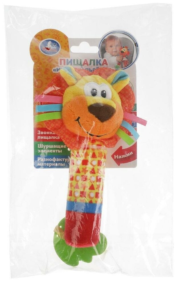 Эта погремушка в виде милой зверюшки, выполненная в ярких цветах из очень мягкого и гипоаллергенного материала. При нажатии игрушка издаёт забавный пищащий звук, а если её потрясти - весело загремят шарики, надежно спрятанные внутри. Прорезыватель интересной формы из качественного безопасного материала пригодится малышу, когда у него будут резаться зубки.