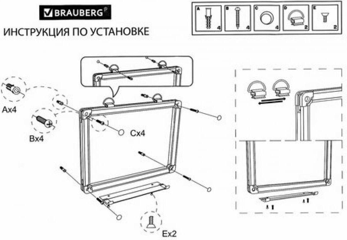 Элементы крепления входят в комплект. Для защиты рабочей поверхности доски на нее нанесена защитная пленка. Перед началом работы – удалить защитную пленку. При должном уходе за рабочей поверхностью доски при помощи чистящей жидкости-спрея и стирателей поверхность магнитно-маркерной доски прослужит более 10 лет.