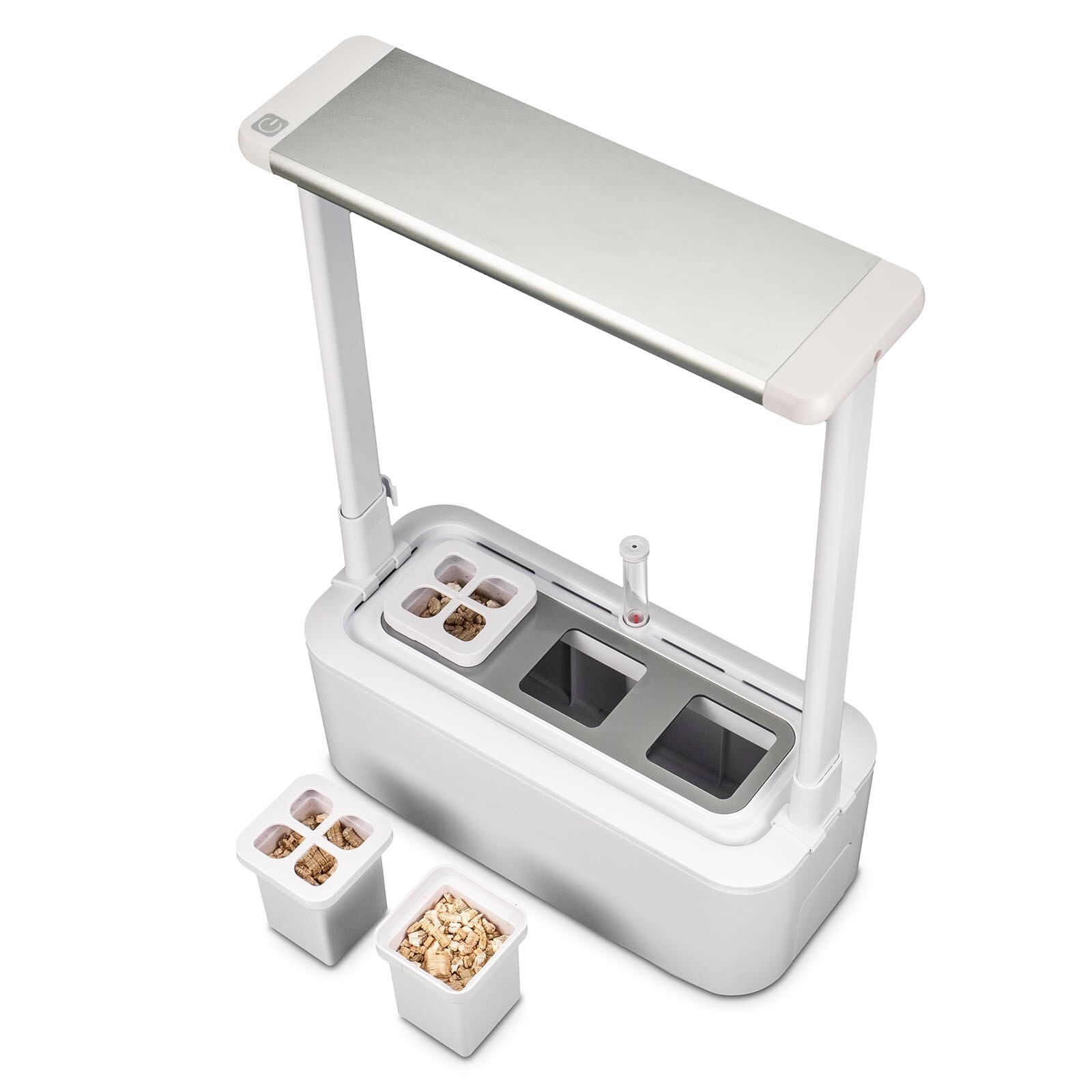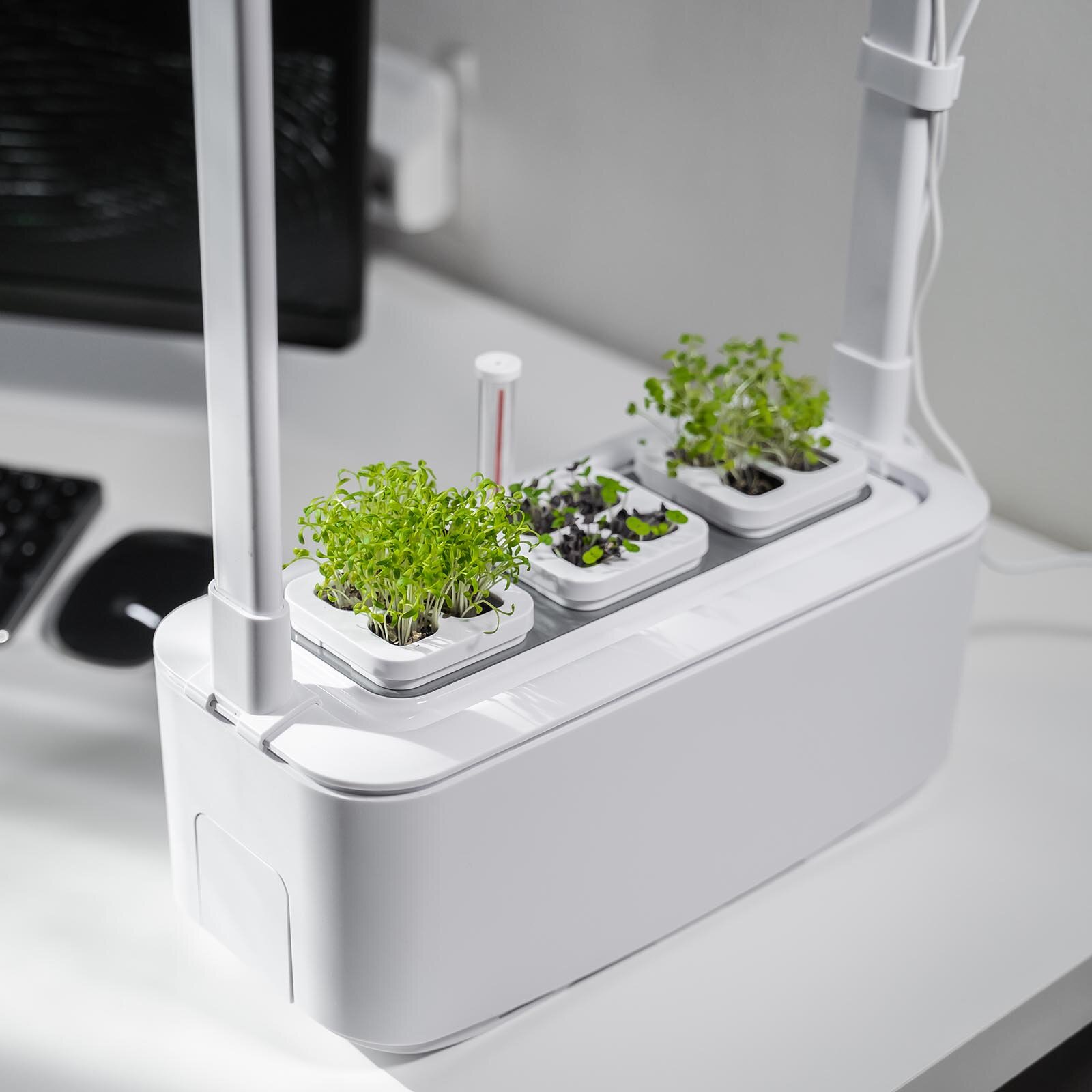 Компактный умный сад с электронной системой управления. Он предназначен для выращивания растений на гидропонике (без использования земли). Оснащен контролем уровня воды и автоматической системой освещения, обеспечивающей быстрое созревание. Обновленная версия получила более мощную лампу, три горшка для выращивания растений и систему циркуляции воды. Работает от сети.