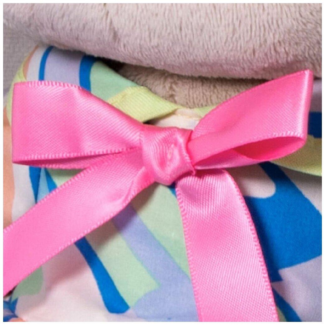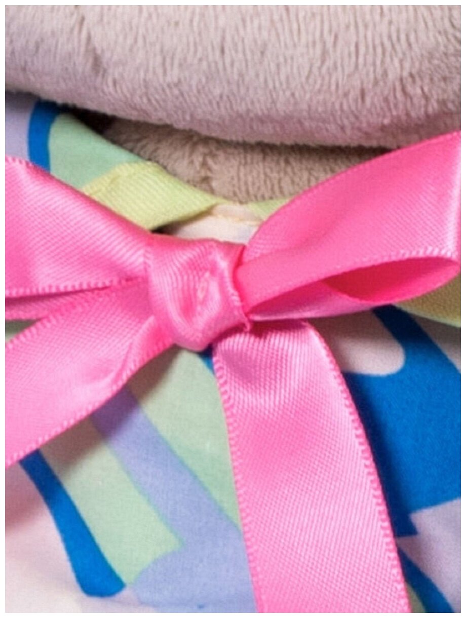Зайка в необыкновенно ярком платье на прохладное лето. Платье из плотного ситца с геометрическим принтом сшито с длинными рукавами. Нижняя юбка, кант по воротничку и низу рукавов выполнен из х/б ткани салатового цвета. Спереди платье украшает нежно-розовый бант из атласной ленты.