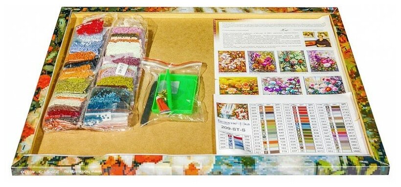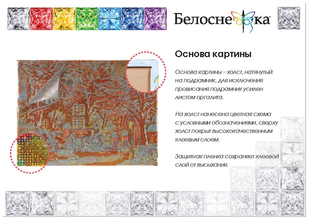 | Комплектация | Холст на подрамнике с клеевой основой, Условные обозначения, Акриловые камни-стразы, Жидкий клей, пинцет, Блюдце, Инструкция, Крепеж для подвешивания. |