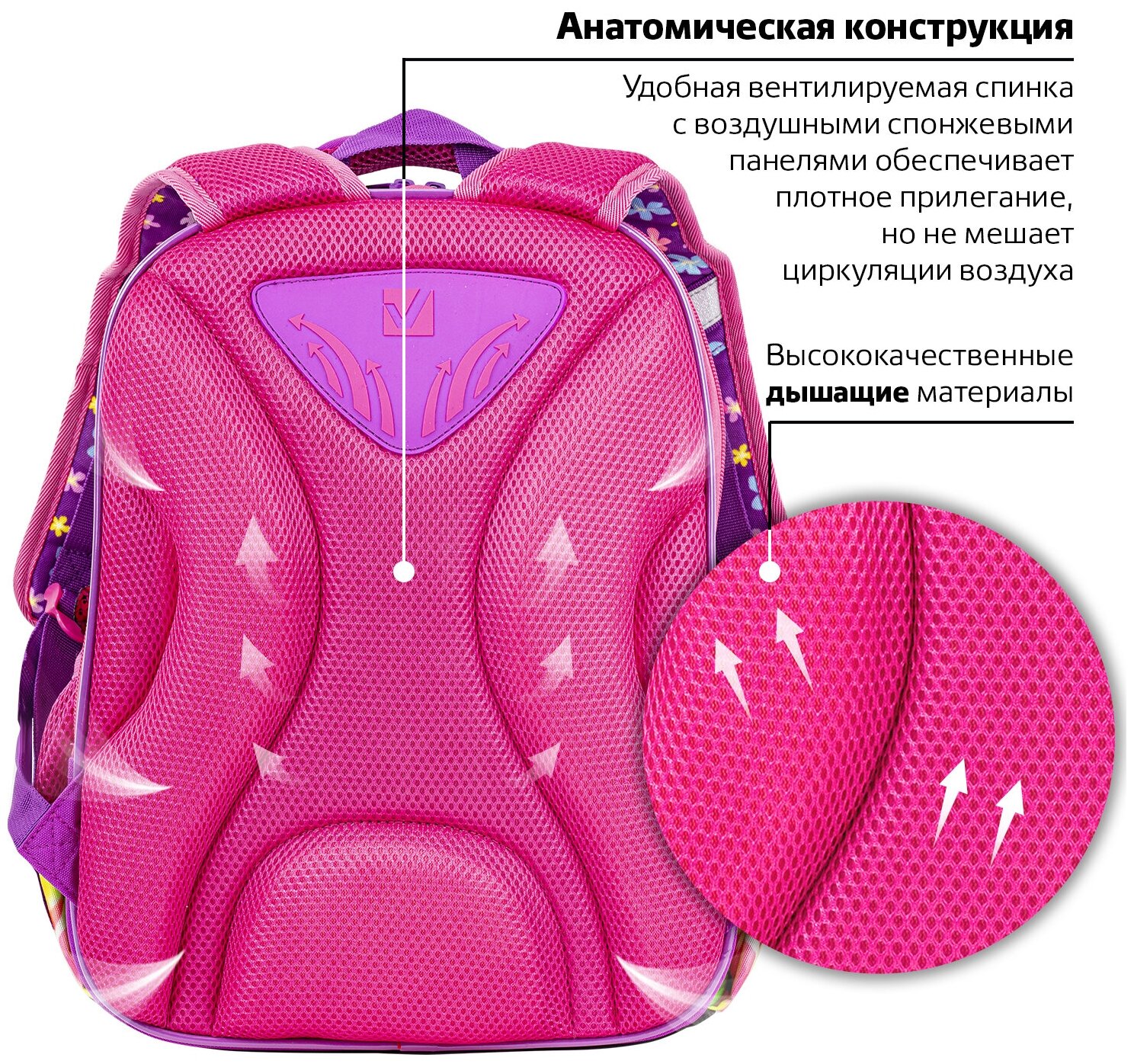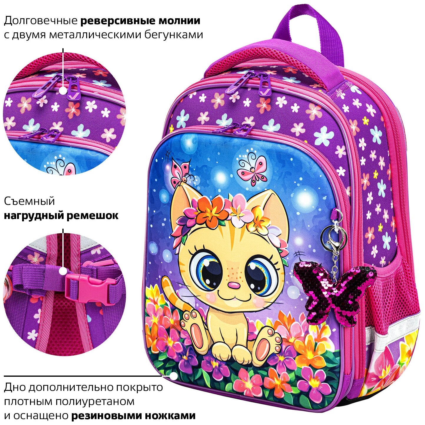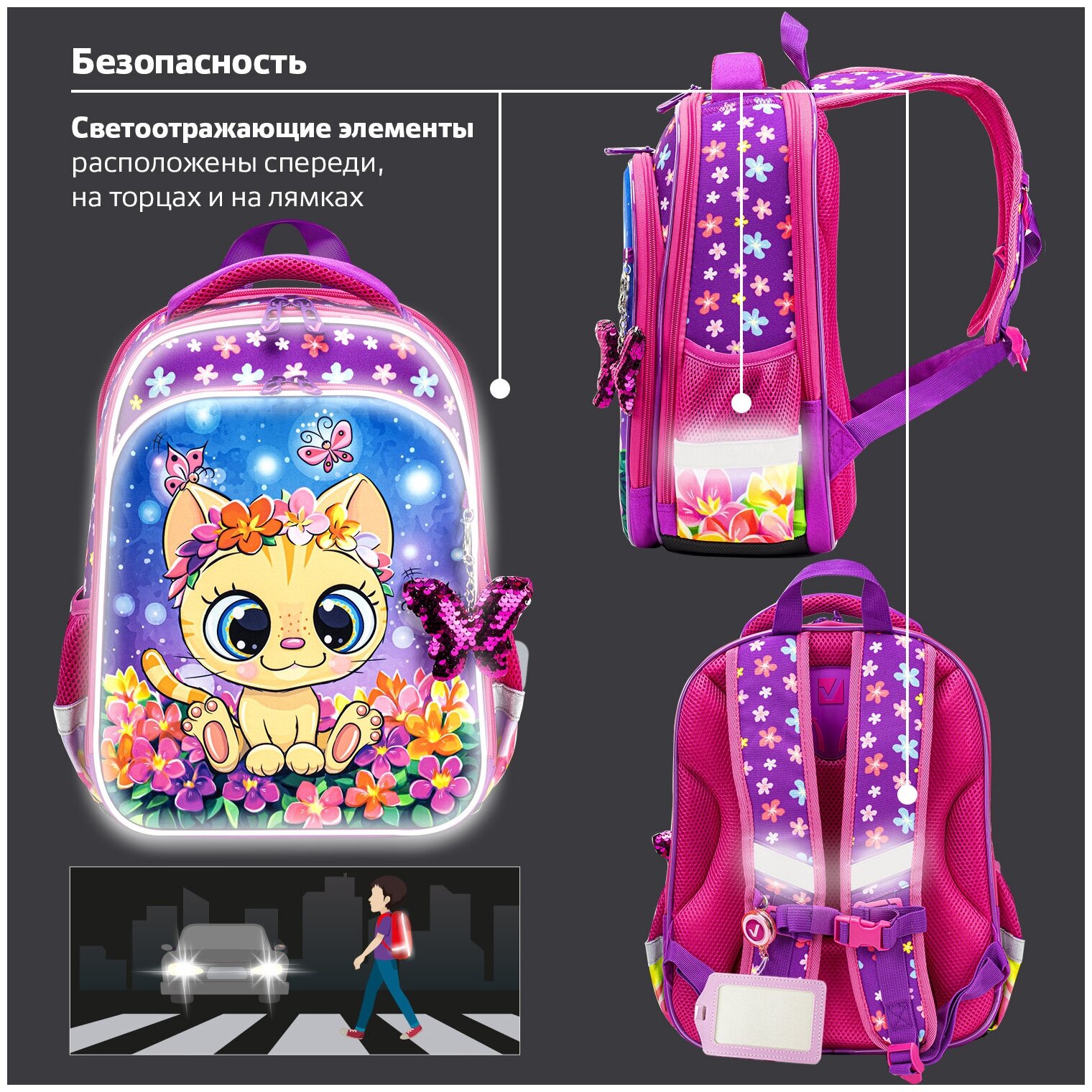Ранец Brauberg QUADRO Charming kitten анатомическая вентилируемая формоустойчивая спинка 3 отделения розовый/сиреневый (270602) Ранец Quadro 3 отделения Charming kitten 37х28х18 см