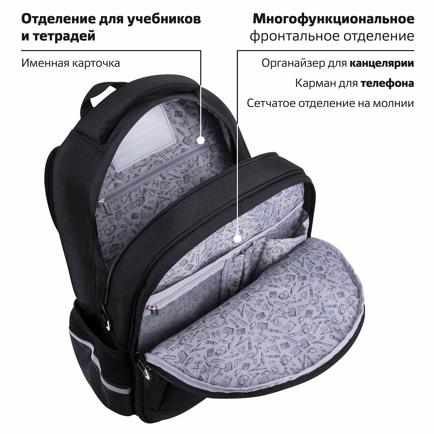 Brauberg Серия рюкзаков Soft предназначена для учеников начальной и средней школы. Размер и структура отделений рюкзака помогут ребенку грамотно разместить в нем учебники, школьные принадлежности и личные вещи. Рюкзак светится в темноте! Светящийся дизайн реализован с помощью современной и технологичной печати на ткани специальной краской. Эффект свечения достигается за счёт накопления дневного или искусственного света. Рюкзак изготовлен из высококачественной влагоотталкивающей нейлоновой ткани — кордура, в которой за счёт особой структуры нити достигнута четырёхкратная стойкость к истиранию по сравнению с простым нейлоном, также эта ткань легко чистится. Широкие дышащие лямки имеют S-образную форму, позволяющие носить рюкзак с комфортом. Удобная мягкая вентилируемая спинка с воздушными спонжевыми панелями разработана с учетом анатомических особенностей детей младшего и среднего школьного возраста. В процессе эксплуатации равномерное распределение нагрузки позволит сохранить правильную осанку! В основном отделении рюкзака можно легко и быстро разместить учебники и тетради формата А4+, а также воспользоваться прижимным отделением и дополнительным карманом на молнии. Также в основном отделении находится именная карточка школьника. Внутри фронтального отделения находится органайзер для канцтоваров, карман для телефона и большое отделение из сетки. Большой передний карман на молнии вмещает тетради и учебники формата А5. Такая организация пространства поможет держать принадлежности в сохранности и приучить ребенка к порядку. Рюкзак легко открывать и закрывать одной рукой с любой стороны — каждое отделение имеет долговечную реверсивную молнию с двумя металлическими бегунками. В боковых карманах на резинке можно разместить бутылочку, термос или зонт. Нести рюкзак будет удобно не только на плечах, но и в руке за прочную уплотненную ручку. Также имеется специальная петелька из плетеной нейлоновой нити для подвешивания на крючок парты. Светоотражающие элементы рюкзака расположены спереди (с помощью высококачественной печати на ткани специальной краской), на торцах и на лямках. Они необходимы для безопасности пользователя в темное время суток. Имеются резиновые ножки для устойчивости и защиты от загрязнений. Рюкзак имеет специальное кольцо для крепления брелока, бейджа или школьного пропуска. Яркая этикетка расположена на передней стороне рюкзака, делая его более заметным на полке магазина, а информация в ней отражает главные потребительские свойства, помогая покупателю принять решение о покупке. Рюкзак упакован в плотный ПЭТ пакет с замком Zip Lock с ручками, который сохранит качество и товарный вид при хранении и транспортировке.