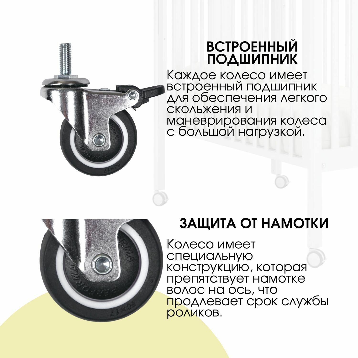 Колёса предназначены для детских кроватей, корпусной мебели, торгового и выставочного оборудования. Колёса имеют каучуковое покрытие, корпус выполнен из высокотехнологичной оцинкованной стали. Вращение происходит с помощью подшипников. Колёса позволяют передвигаться по любому покрытию: ламиниту, линолеуму, паркету и даже кафельной или гранитной плитке. Колёса не оставляют следов, не шумят, а ваш пол не поцарапается и не испачкается черными полосами. Изделия оснащены стопорами, которые надежно фиксируют колёса на любой поверхности. Штырь крепления с резьбой М8 (8мм) и высотой 20мм обеспечивает надежное соединение колеса с мебелью и служит для распределения нагрузки. В наборе 4 колеса диаметром 50мм. Нагрузка на одно колесо - до 27 кг.