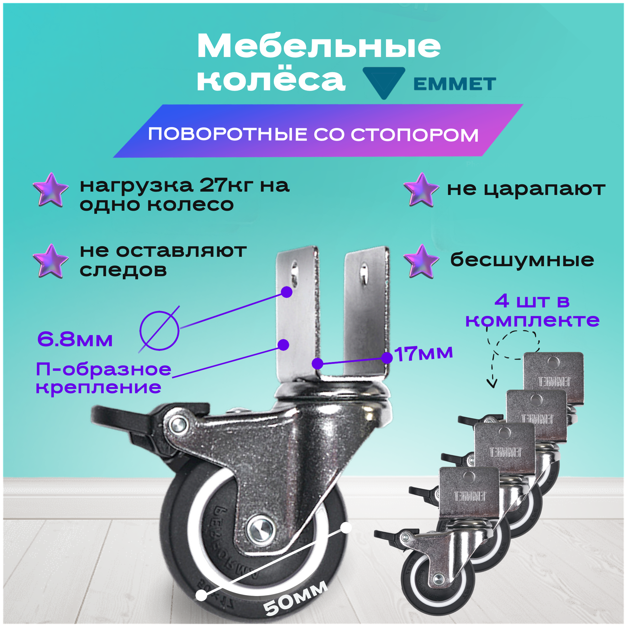 Комплект мебельных колес EMMET со стопором / п-образная пята 17мм в комплекте 4 шт Комплект мебельных колес со стопором п-образная пята 17 мм 4 шт.