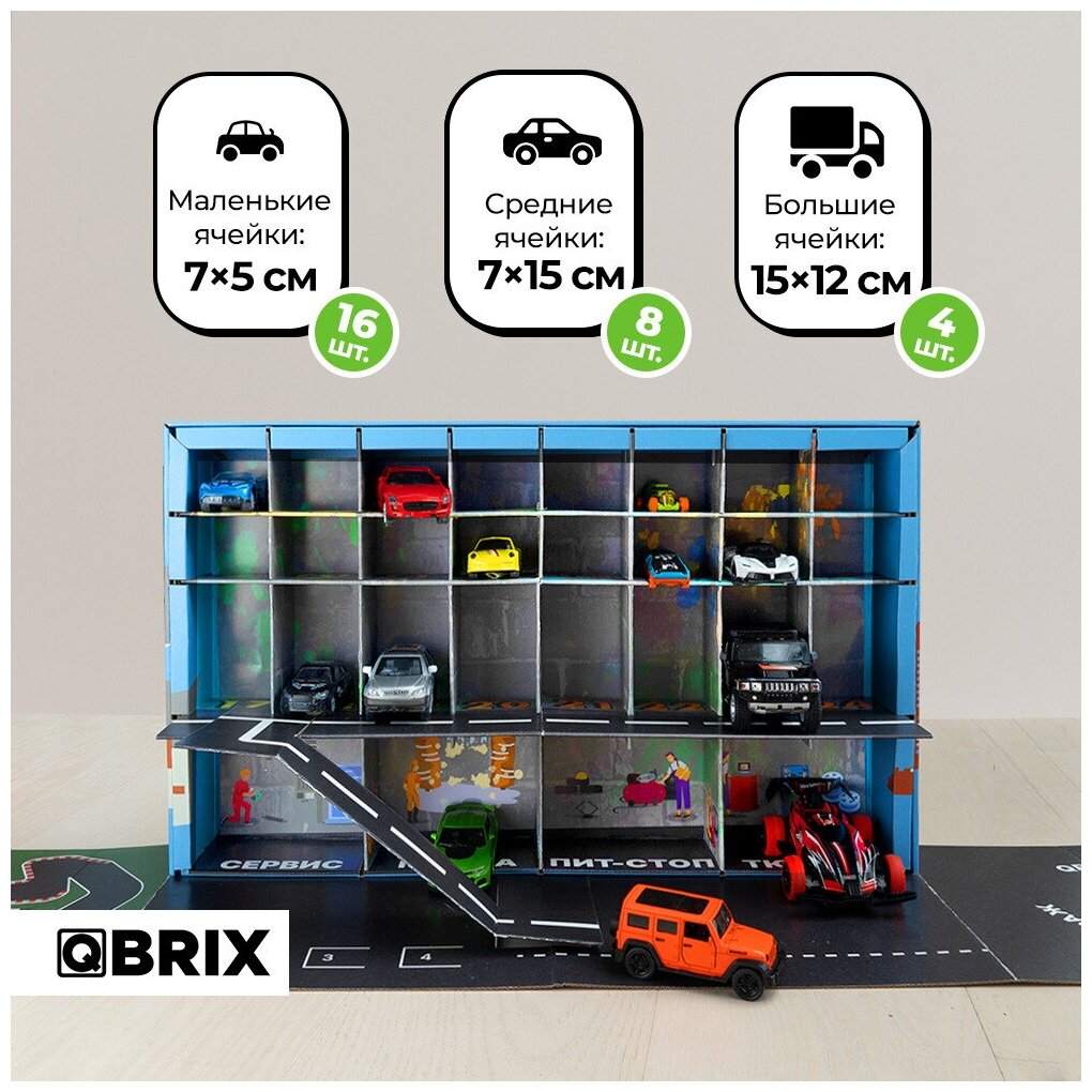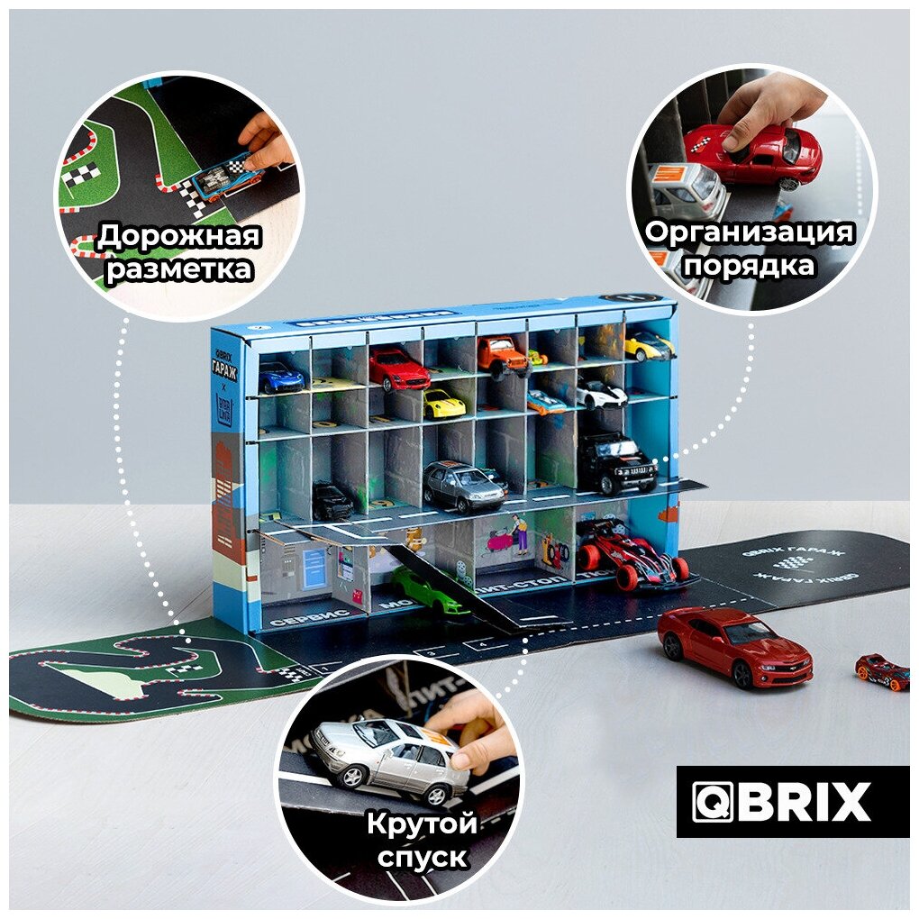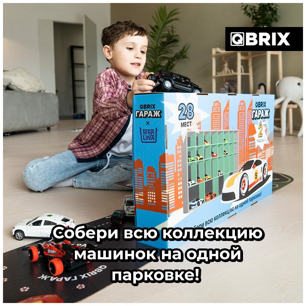 Qbrix гараж - собери всю коллекцию машинок на одной парковке! Парковка для игрушечных автомобилей станет прекрасным подарком для ребенка! Набор легко собирается и разбирается, все необходимое уже в комплекте. Гараж впишется в любой интерьер детской комнаты, а главное его удобно хранить.