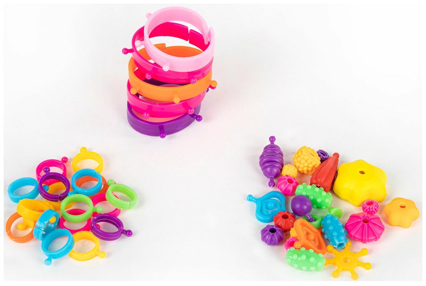 Конструктор POP-BEADS представляет собой набор из 550 пластиковых бусин различных цветов, форм и размеров. Также в набор входят основы для создания украшений: кольца и браслеты.