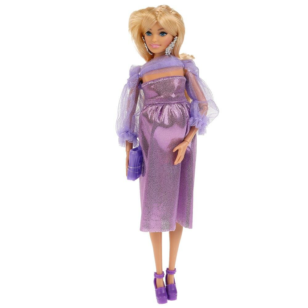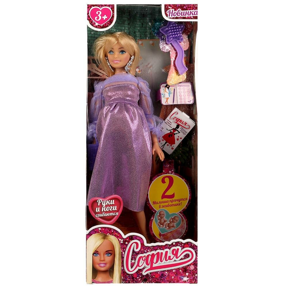 Будущая мама София одета в нарядное сиреневое платье. Образ куколки дополняют модные крупные серьги и элегантная сумочка. Одежду и аксессуары легко снять и надеть. С такой модной куклой девочке будет интересно и весело играть: благодаря тому, что руки и ноги куклы подвижны, им можно придать любое положение.