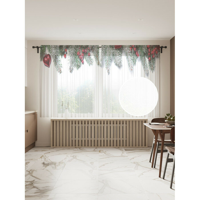 Фототюль JoyArty "Еловая ветка с игрушками" 145x180см 2 полотна лента 50 крючков Фототюль Еловая ветка с игрушками 2 полотна со шторной лентой + 50 крючков 145x180 см