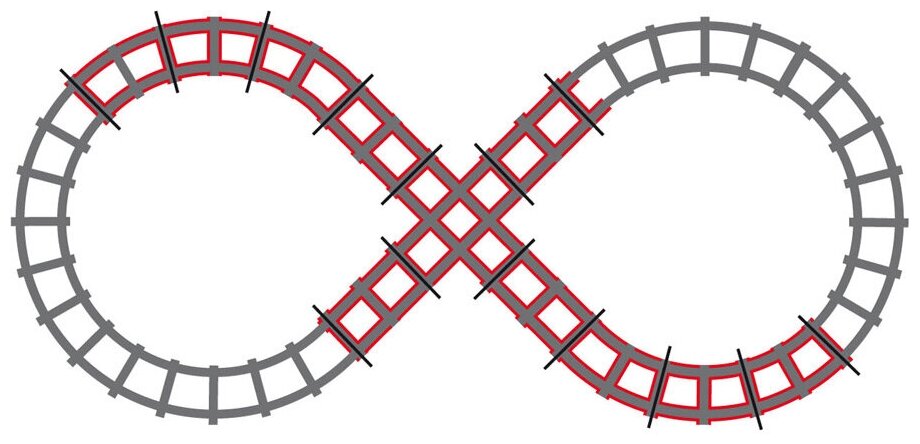 Расширьте свои горизонты. С помощью 4 прямых рельсов, 6 изогнутых и одного перекрестка дополнительно к рельсам, прилагающихся к поезду, можно создать комбинацию «Восьмерка».