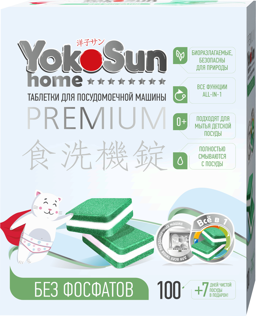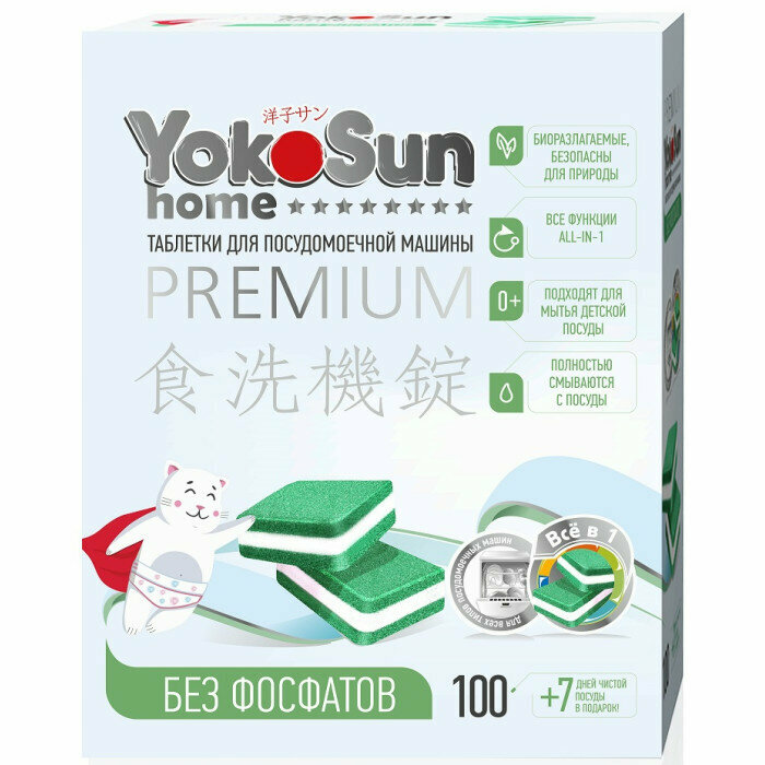Таблетки для посудомоечной машины YokoSun, бесфосфатные. Специально разработаны для домашних посудомоечных машин всех типов. Эффективно и деликатно удаляют самые стойкие загрязнения при любых температурных режимах, не оставляя разводов на поверхности посуды и неприятного запаха. Одна таблетка включает в себя все функции таблеток All in 1. Не содержат фосфатов, биоразлагаемые и безопасны для природы и человека.