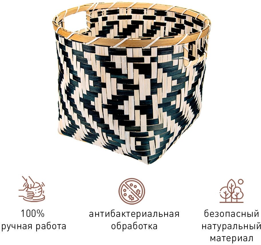 Поверхность обработана водоотталкивающим и антибактериальным покрытием, поэтому корзину можно использовать в ванных комнатах. Корзина представлена в совершенно эксклюзивном этническом направлении, что позволит создать в доме индивидуальную обстановку.