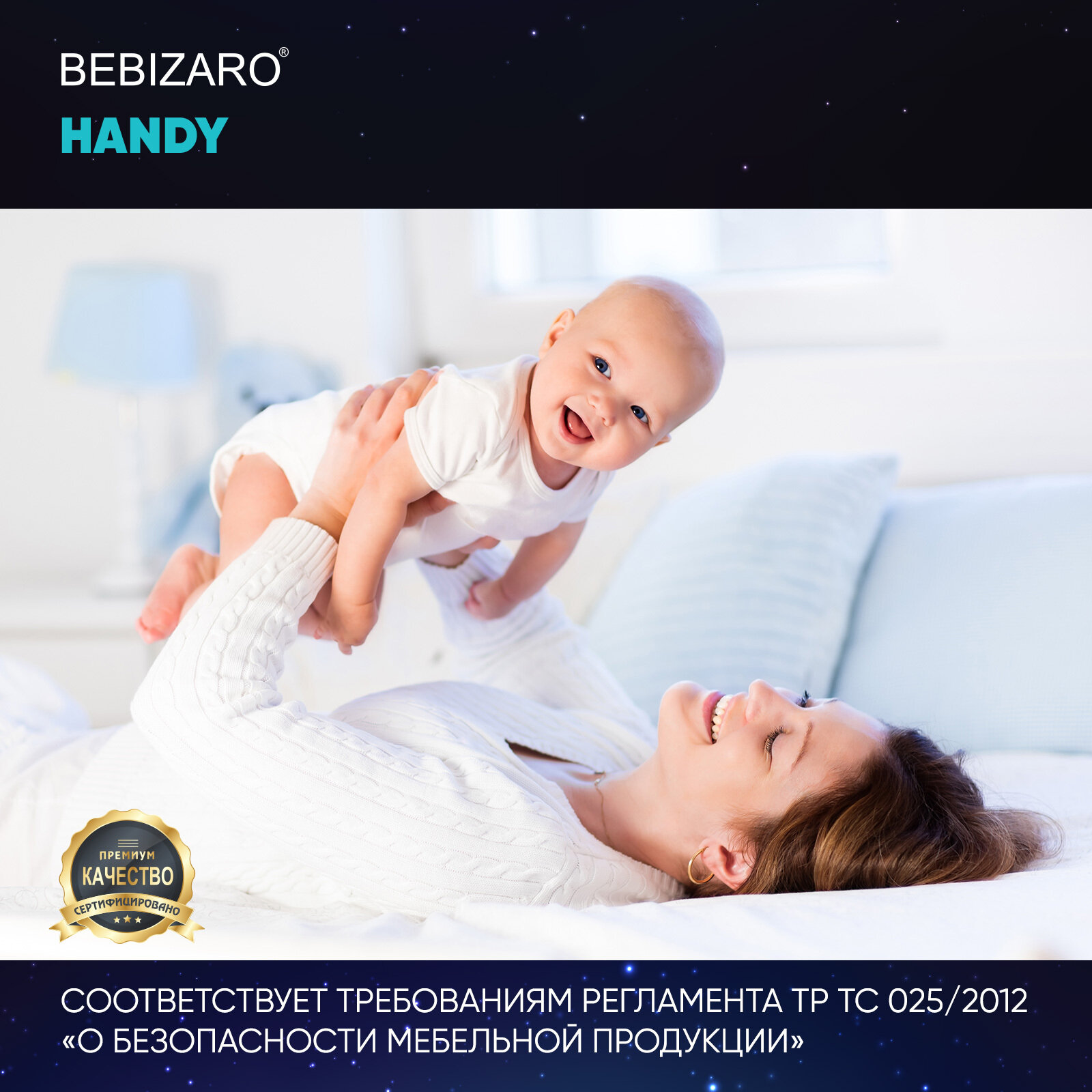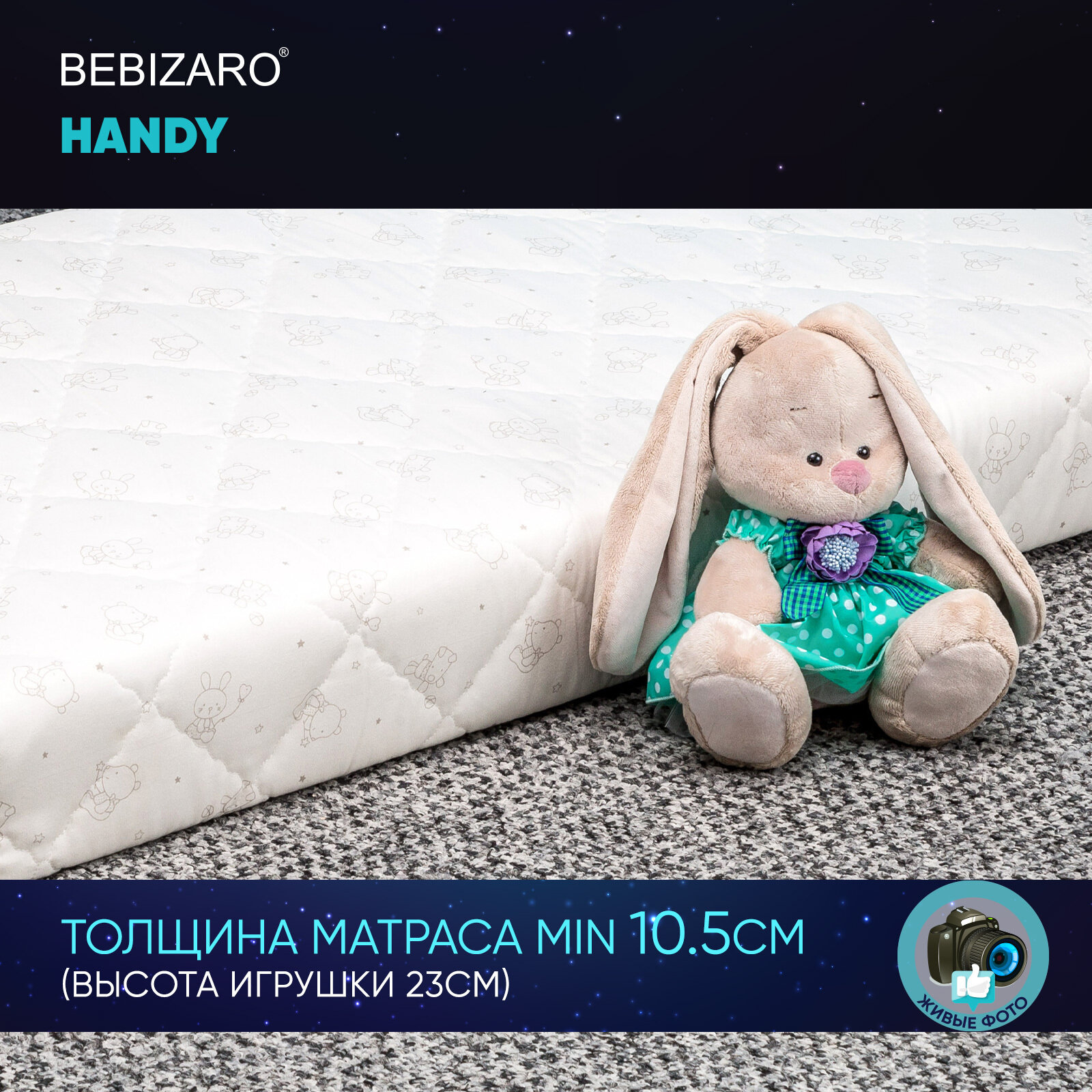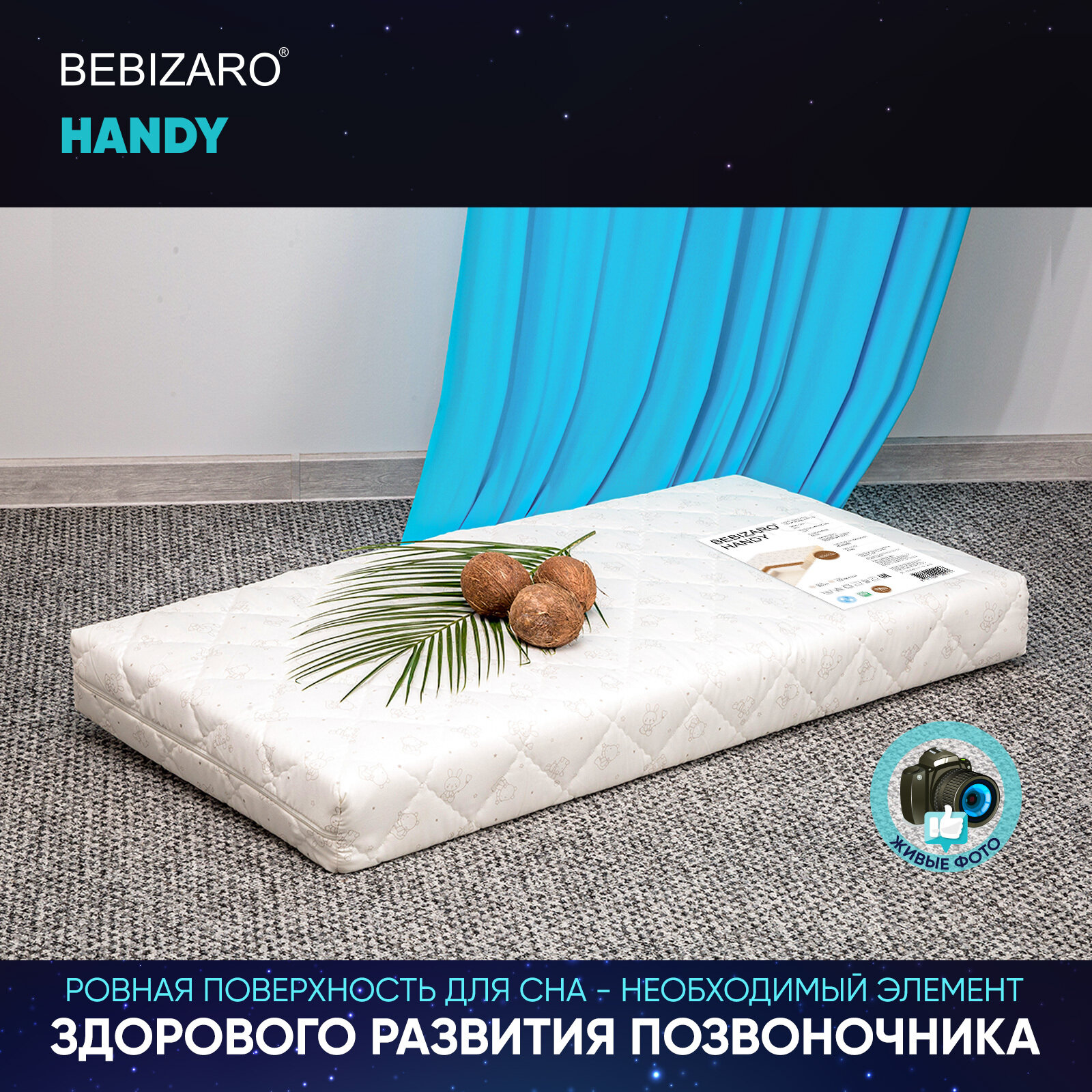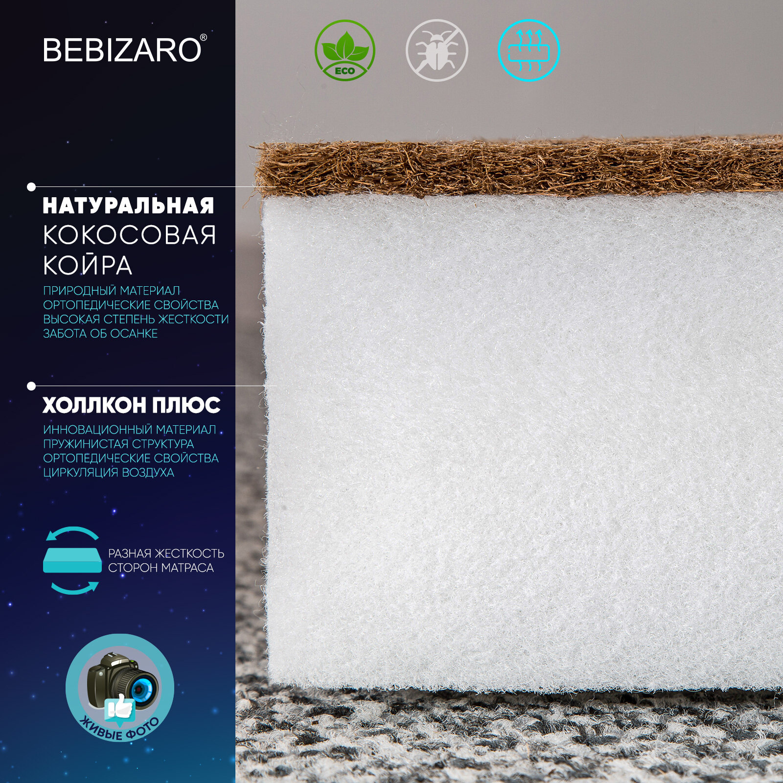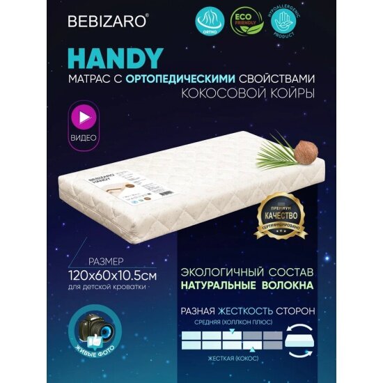 Детский матрас BEBIZARO HANDY 120х60х11 см, Ортопедический матрас - имеет две стороны разной жесткости, обеспечивает здоровый и комфортный сон детей от рождения до 3-4 лет. Подходит для кровати со спальным местом 120х60 см. Двусторонний матрас решает сразу две задачи: одна сторона обеспечивает жесткую поддержку позвоночника с самого рождения, а на второй стороне расположены более эластичные материалы для комфортного сна ребенка от 6-ти месяцев.