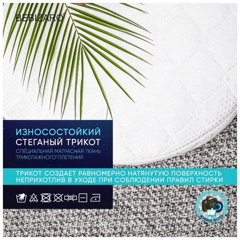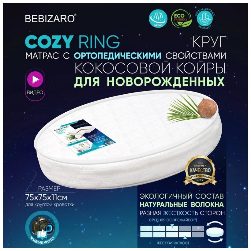 Детский матрас BEBIZARO COZY RING 75х75х11 см, Ортопедический матрас - имеет две стороны разной жесткости, обеспечивает здоровый и комфортный сон детей. Подходит для кровати со спальным местом 75х75 см. Двусторонний матрас решает сразу две задачи: одна сторона обеспечивает жесткую поддержку позвоночника с самого рождения, а на второй стороне расположены более эластичные материалы для комфортного сна ребенка.