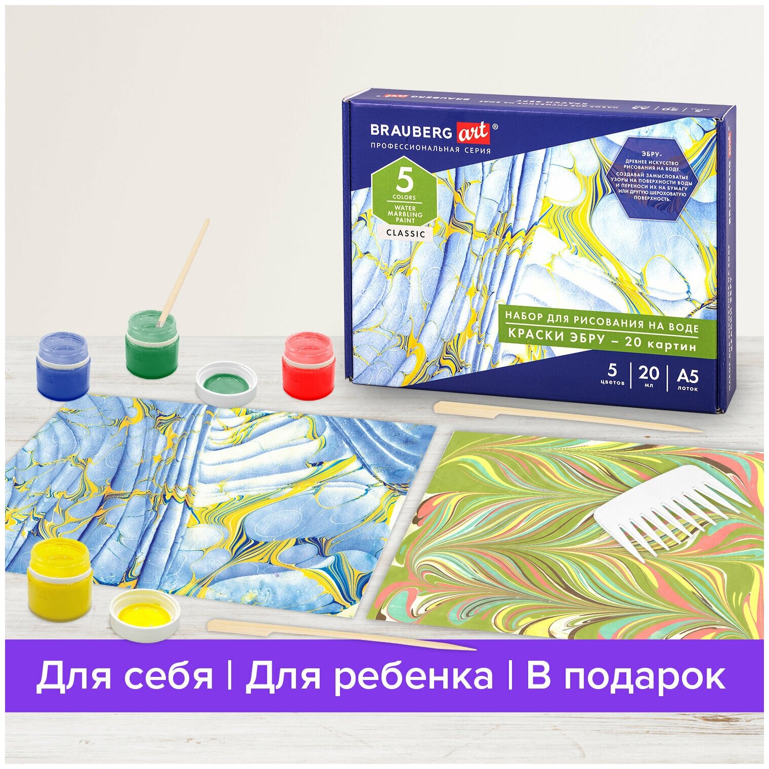 Рисование на воде в технике Эбру – древнее искусство создания узоров на поверхности воды с последующим их переносом на бумагу, ткань, гипс, керамику, и любую другую шершавую поверхность. В набор входят: 5 баночек со специальной краской (красный, синий, зеленый, белый, желтый), 1 пластиковый лоток размером А5, бумага 20 листов размером А5, 2 саше с загустителем, кисть, гребень, 3 деревянных шпажки, подробная творческая инструкция.