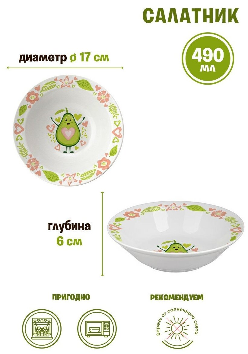 Набор посуды изготовлен из фарфора, состоит из 3-х предметов: тарелки диаметром 18,5 см, салатника диаметром 17 см и кружки 220 мл. Отличается оригинальным дизайном с изображением авокадо.