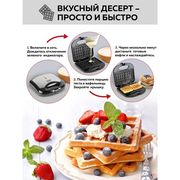 | Высокая мощность | 750 Вт и двусторонний нагрев панелей обеспечат быстрый нагрев вафельницы, а также равномерное приготовление венских или бельгийских вафель. |