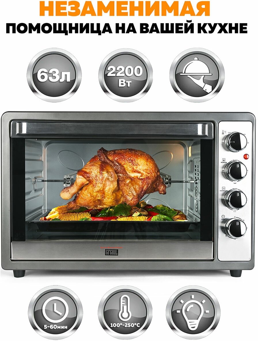 Электрическая многофункциональная мини-печь GFGRIL GFO-62 в стильном корпусе из нержавеющего металла станет полноценной заменой духовки. Она подойдет всем, кто не хочет тратить много времени на приготовление пищи, но при этом хочет питаться вкусно и полезно. Высокая мощность 2 200 Вт обеспечит быстрое приготовление продуктов. Внутренний объём XXL 63 литра позволяет приготовить птицу, мясо, пироги, рыбу и овощи на всю семью или на большую компанию. Толстое закаленное стекло надежно защищает от жара и позволяет наблюдать за процессом приготовления. Внутри камеры расположен вентилятор для конвекции и лампочка для подсветки.