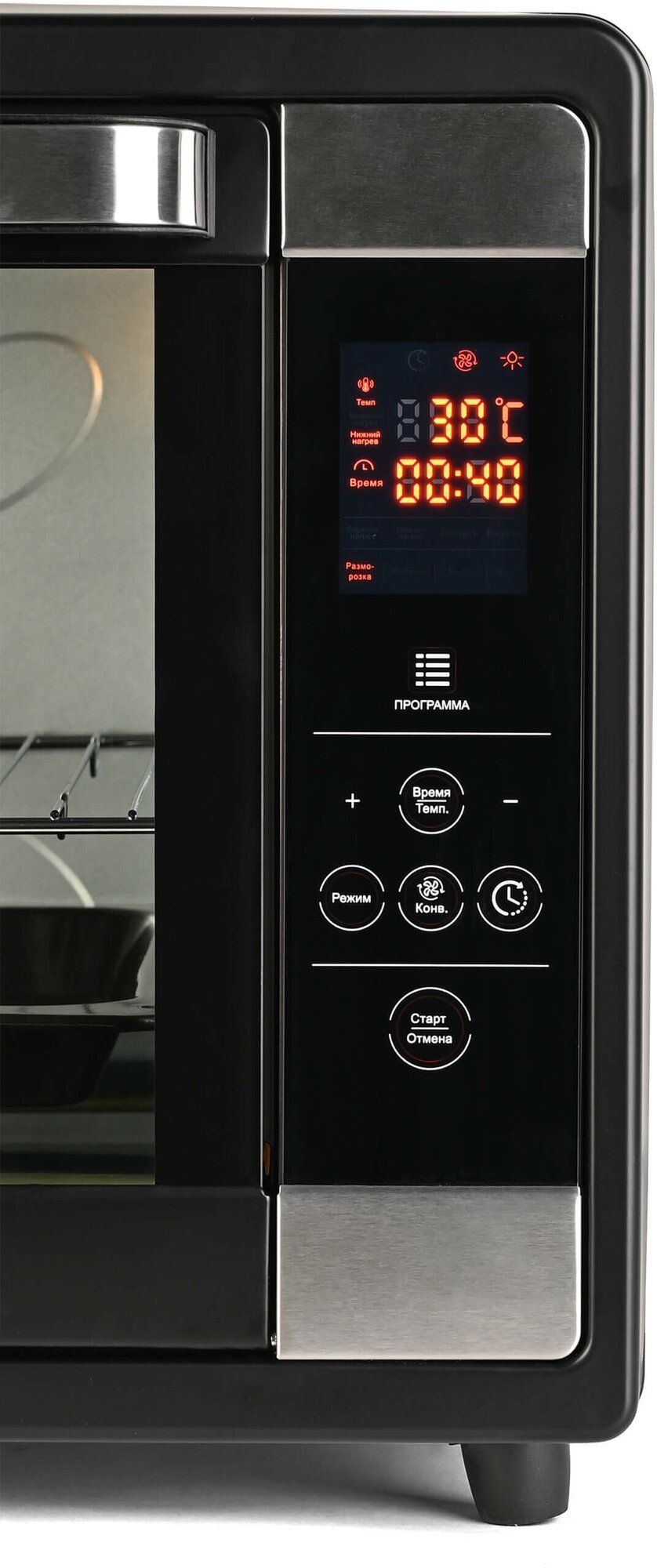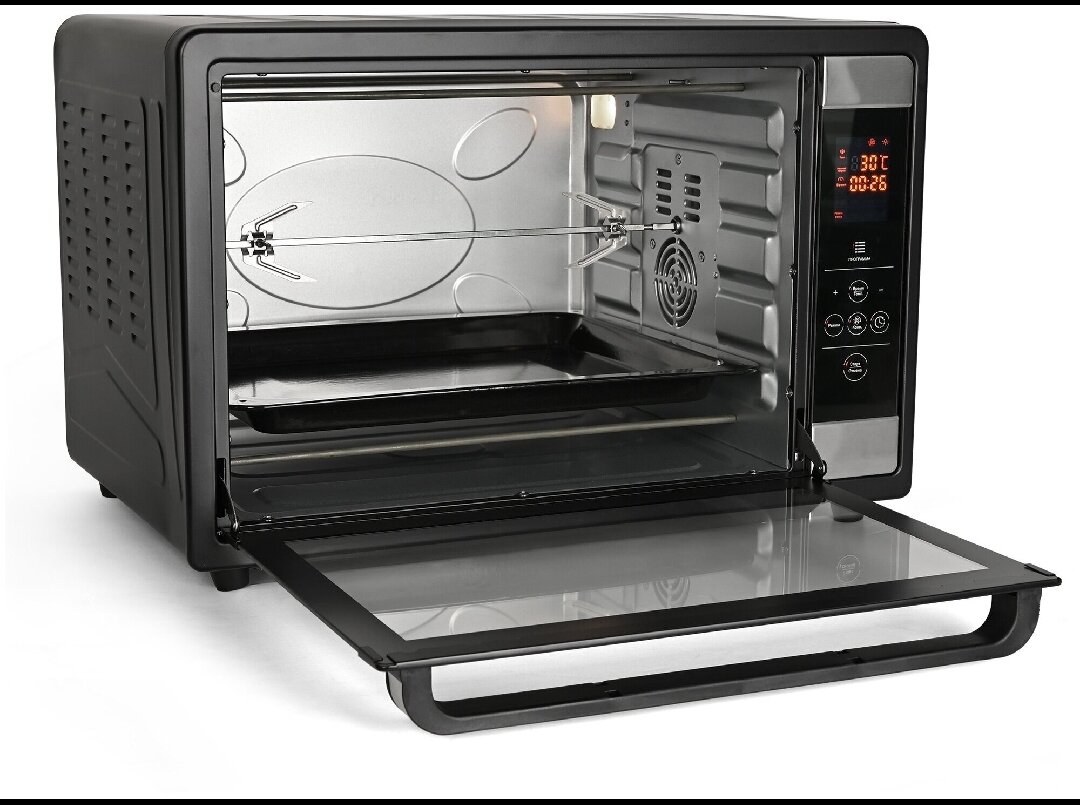 Толстое закаленное стекло надежно защищает от жара и позволяет наблюдать за процессом приготовления. Внутри камеры расположен вентилятор для конвекции и лампочка для подсветки.