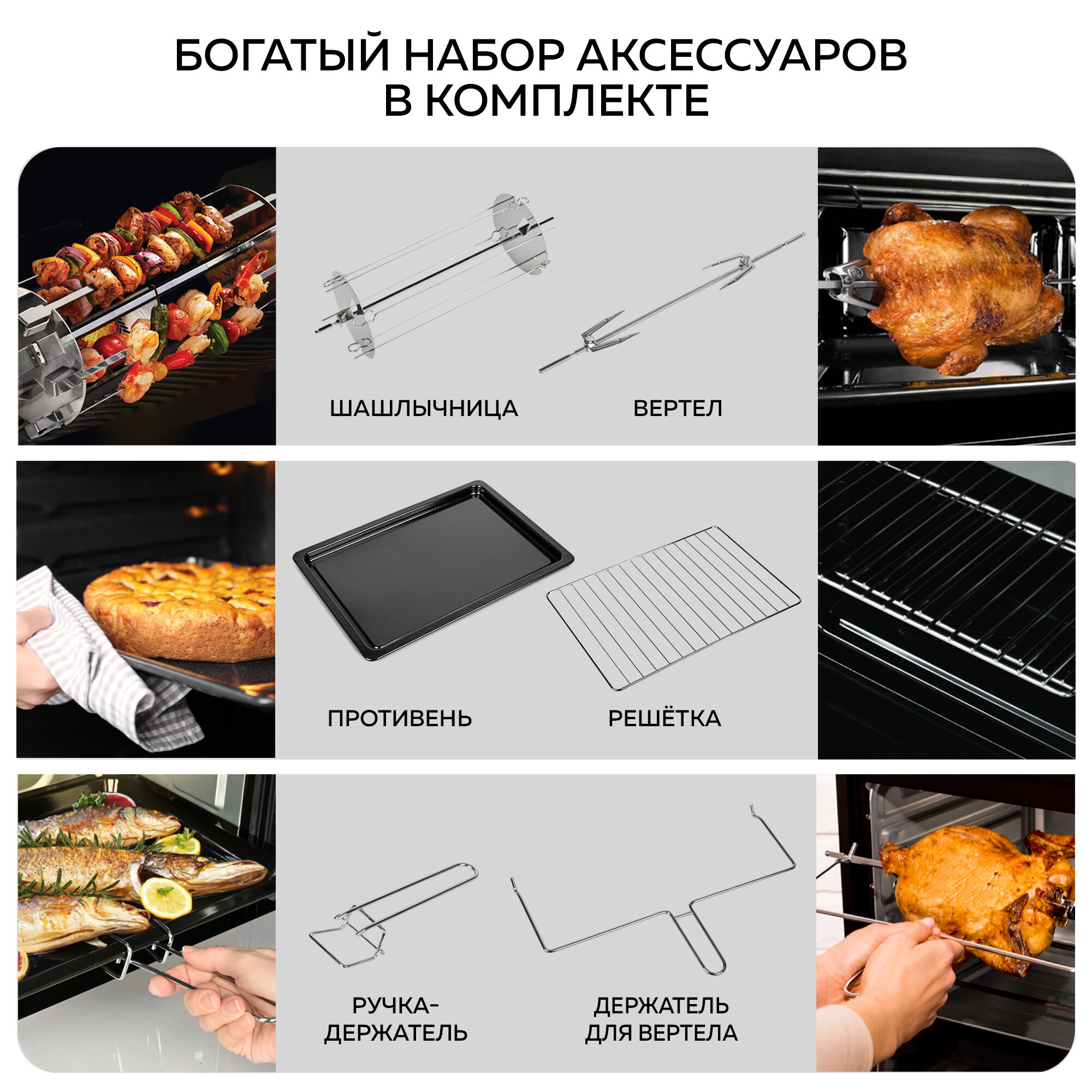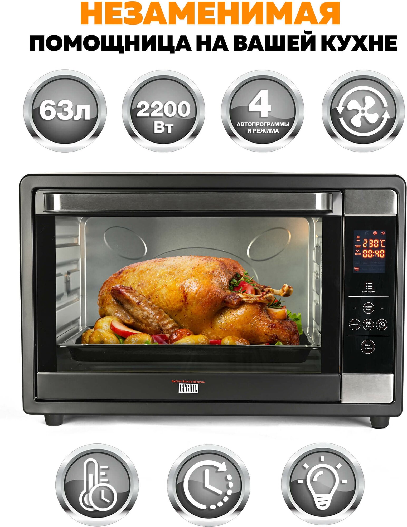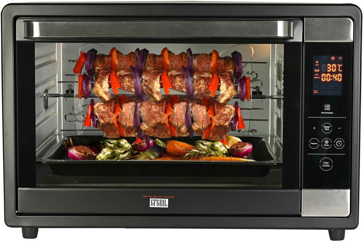 Электрическая многофункциональная мини-печь GFGRIL GFOO-7 станет полноценной заменой духовки. Она подойдет всем, кто не хочет тратить много времени на приготовление пищи, но при этом хочет питаться вкусно и полезно. Высокая мощность 2 200 Вт обеспечит быстрое приготовление продуктов. Внутренний объём XXL 63 литра позволяет приготовить птицу, мясо, пироги, рыбу и овощи на всю семью. Конвекция в сочетании с различными режимами работы (Вертел/Верхний нагрев/Нижний нагрев/Нагрев), а также набор аксессуаров, входящих в комплект – противень, вертел, шашлычница, решетка-гриль, а также зажим для противня/решетки/вертела – дают простор для воплощения любых кулинарных фантазий.