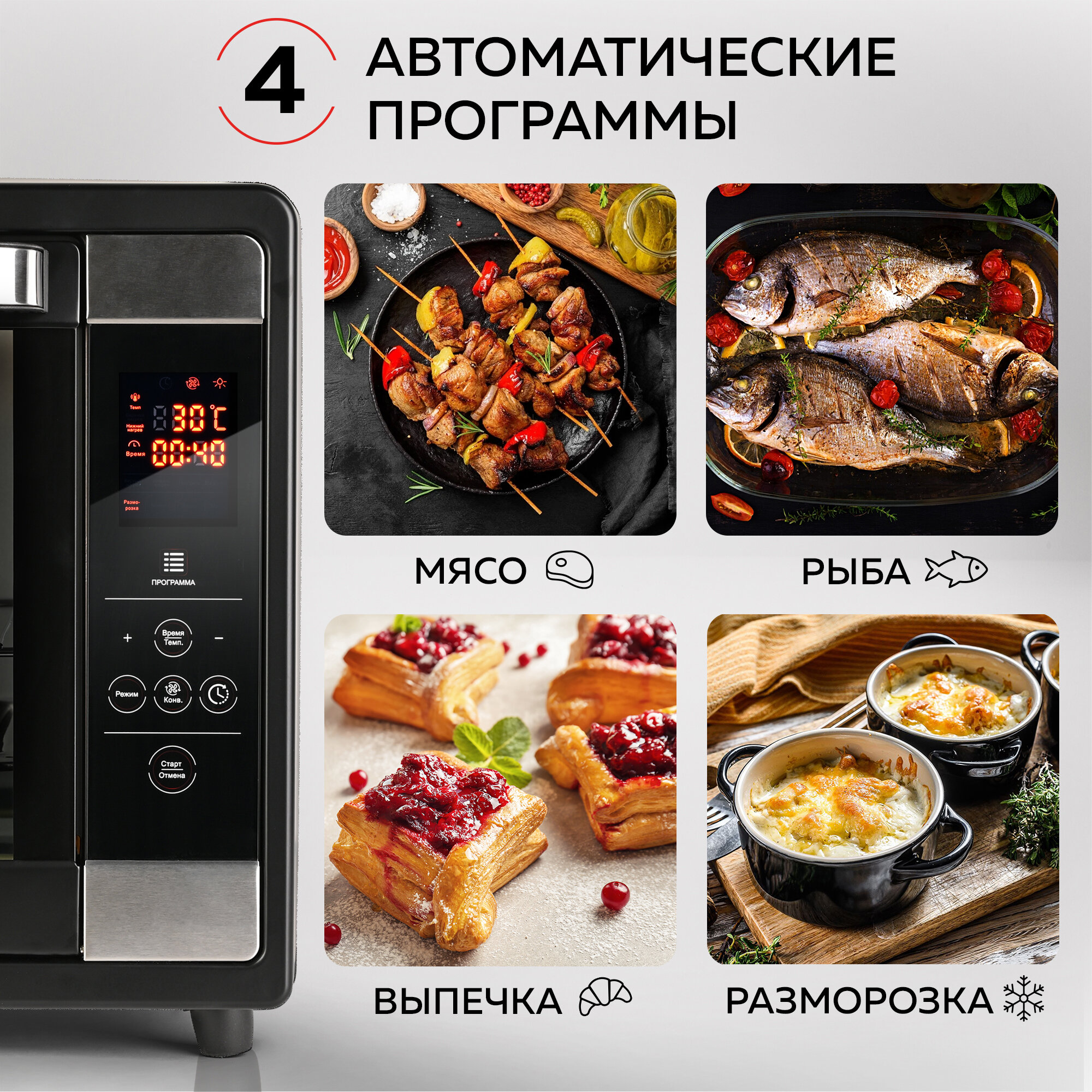 Многофункциональная электропечь GFOO-7 отличается удобным электронным управлением с возможностью выбора одной из 4х предустановленных программ: