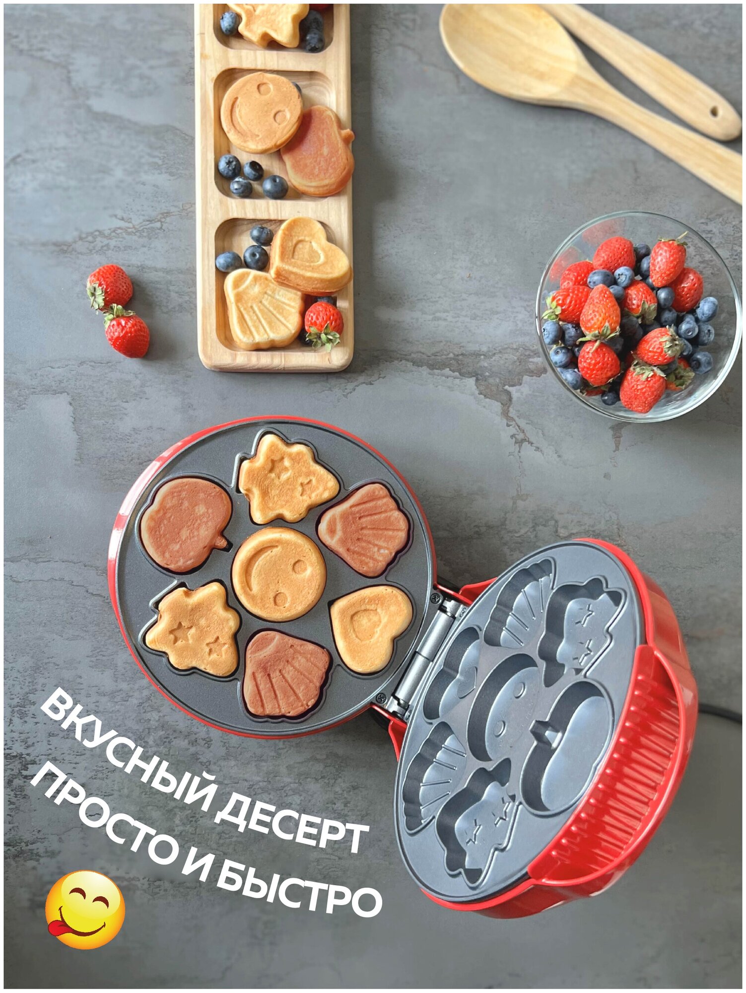 С помощью нашей вафельницы Вы сможете приготовить сразу 7 фигурных мини-вафель или бисквитных пирожных. Экспериментируйте и балуйте себя разнообразными десертами каждый день – бисквитные, шоколадные, творожные, сырные, овощные вафли, с начинкой или без – это лишь несколько примеров того, что можно приготовить на электровафельнице.