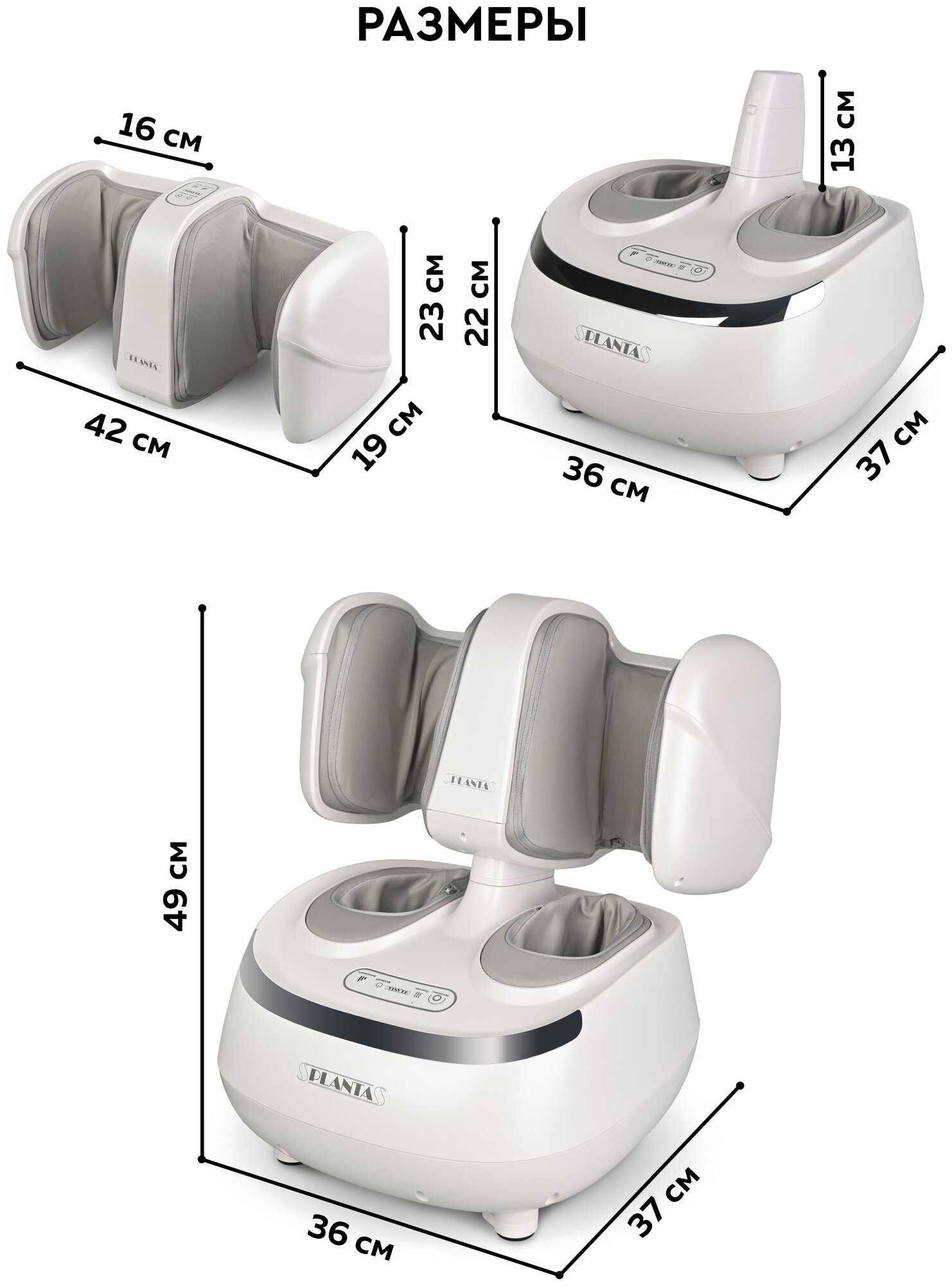Массажер для ног имеет 3 программы массажа - восстанавливающий, расслабляющий и интенсивный массаж – которые легко можно выбрать на панели управления прибора, как на нижнем основном блоке, так и на съемном беспроводном. 3 разных вида массажных роликов эффективно прорабатывают всю стопу от кончиков пальцев до пятки, оказывая воздействие на акупунктурные точки на стопе, а компрессия воздействует со всех сторон на зону массажа, создавая 3D эффект, и усиливается действие массажных роликов.