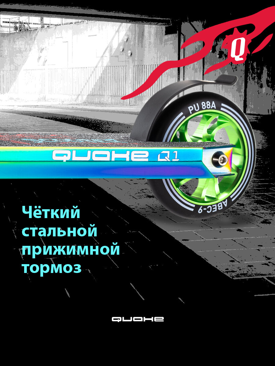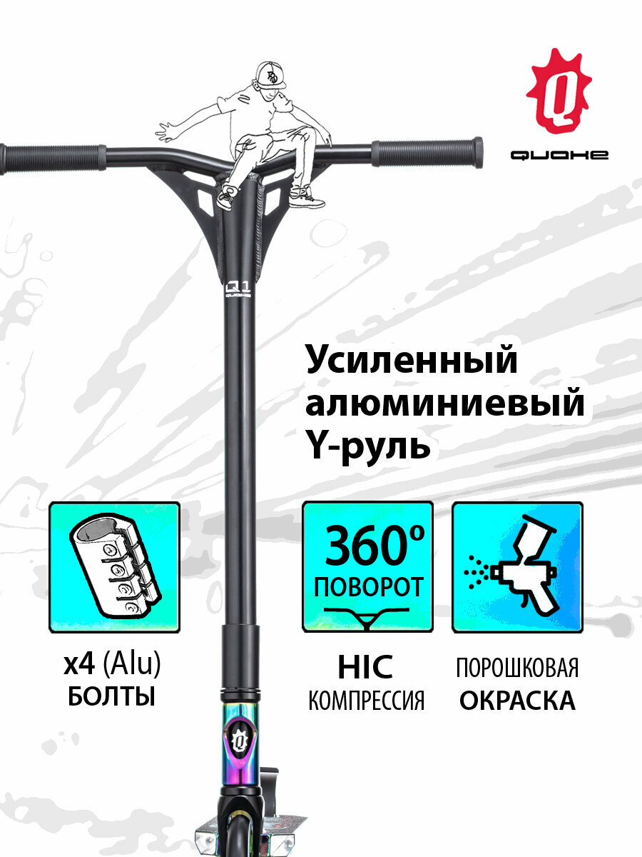 Трюковой самокат QUAKE со скоростными колесами 110 мм, HIC компрессией руля и цветной гальванизацией – идеальный трюковый самокат для райдеров ростом от 125 до 170 см и весом до 100 кг.