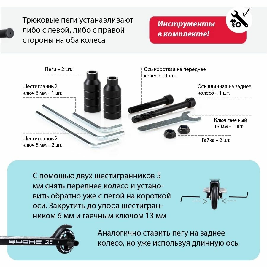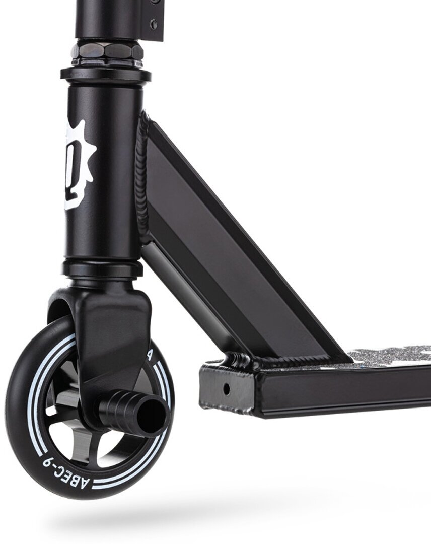 Трюковой самокат QUAKE с маневренными колесами 100 мм и подшипниками ABEC-9 и 4-х болтовым хомутом – надежный трюковый самокат начального уровня для райдеров ростом от 120 до 165 см и весом до 100 кг.