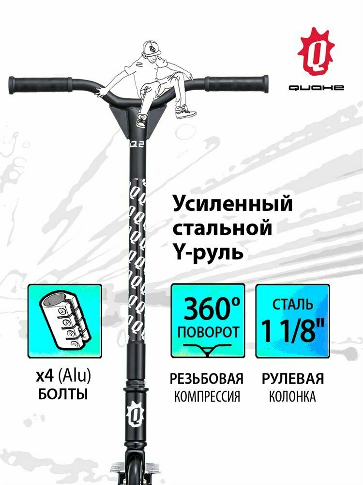 В модели QUAKE из алюминия изготовлены диски, дека, рулевая соединительная труба, основы колес и зажим на 4 болта. Вилка выполнена из стали, дополнительно усилена и имеет Y-образную форму. Руль трюкового самоката легко вращается на все 360 градусов для выполнения трюков любой сложности. В руле используется резьбовая компрессия. Прижимной ножной тормоз из малоуглеродистой марганцовистой стали.