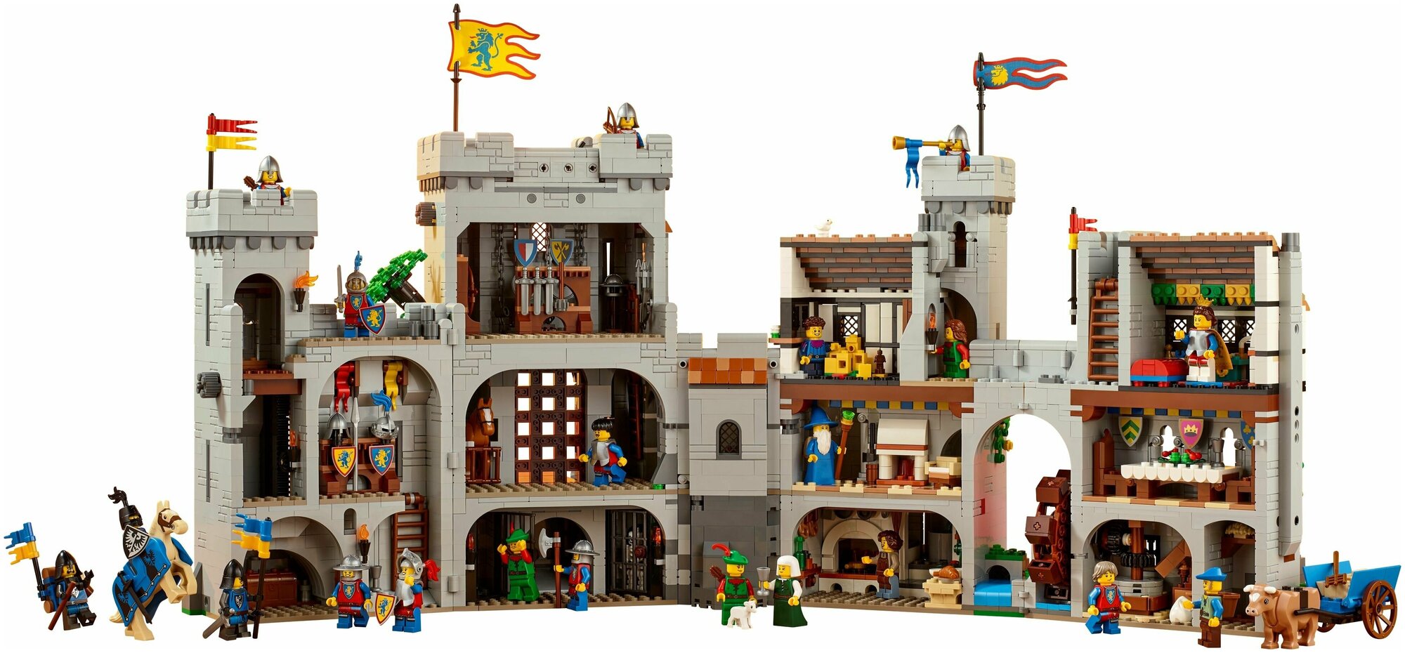 Двадцать две минифигурки: королева львиного клана, девять бойцов львиного клана, три бойца чёрных соколов, два воина лесников, торговец, колдун, служанка, фермер, два ребёнка и скелет. Плюс фигурки животных, в том числе лошадей в попонах, барашка, коровы и птички. Размеры замка в закрытом виде: 38 см в высоту, 44 см в длину, 33 см в ширину. Набор произведён по случаю 90-летнего юбилея компании LEGO.