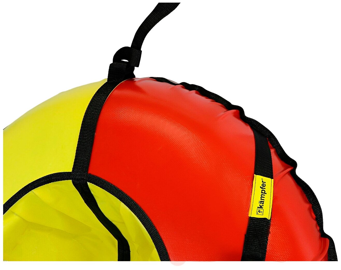 Удобные крепкие тканевые ручки предназначены для комфортного скатывания с горы и управления тюбингом. Для перемещения ватрушки в комплект входит буксировочный трос. Камера тюбинга надежно защищена от снега вшитой в чехол молнией.