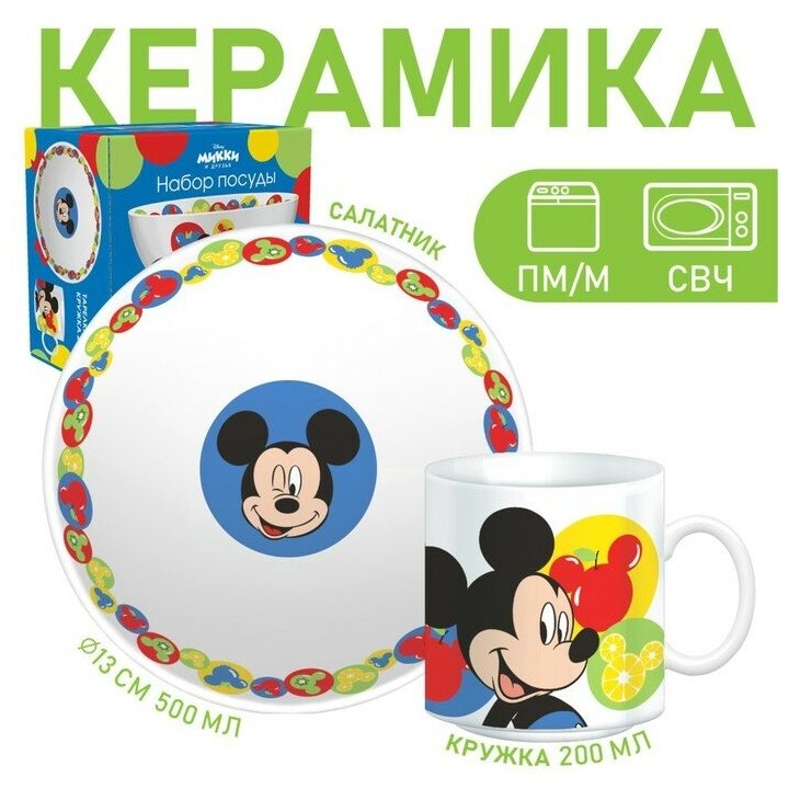 Комплектация: салатник, кружка, Микки Маус и его друзья.