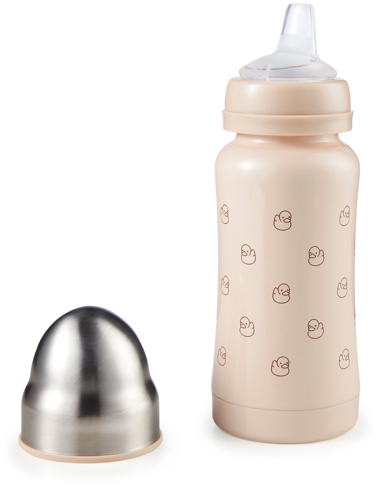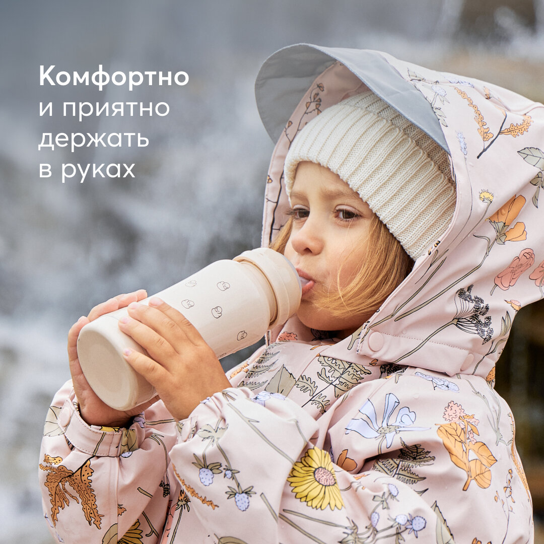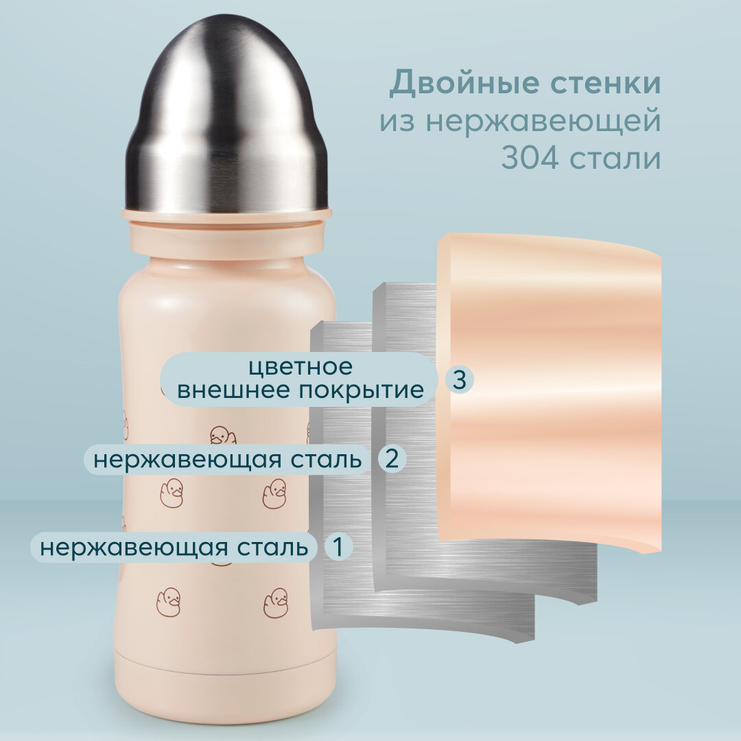 Корпус из нержавеющей 304 стали сужается к середине, бутылочку приятно и удобно держать в руках детям и взрослым. Благодаря покрытию и конструкции бутылочки, корпус не обжигает, даже если внутри кипяток. Плотная крышка закрывает бутылку, исключая вытекание жидкости и попадание грязи на соску.