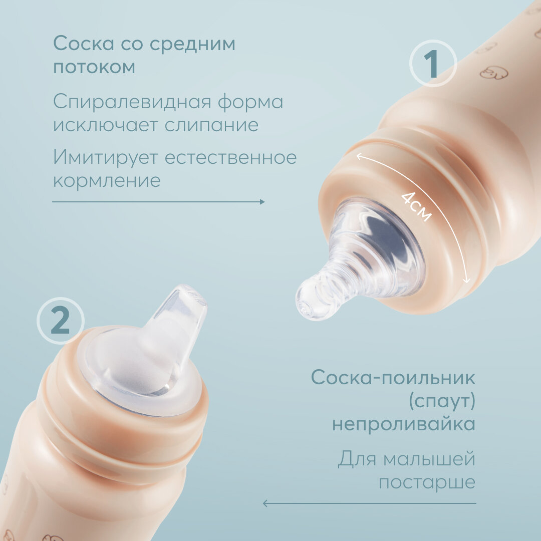 В комплекте 2 насадки: соска для малышей и соска-поильник непроливайка для малышей постарше, а также бутылочка имеет антиколиковую систему.