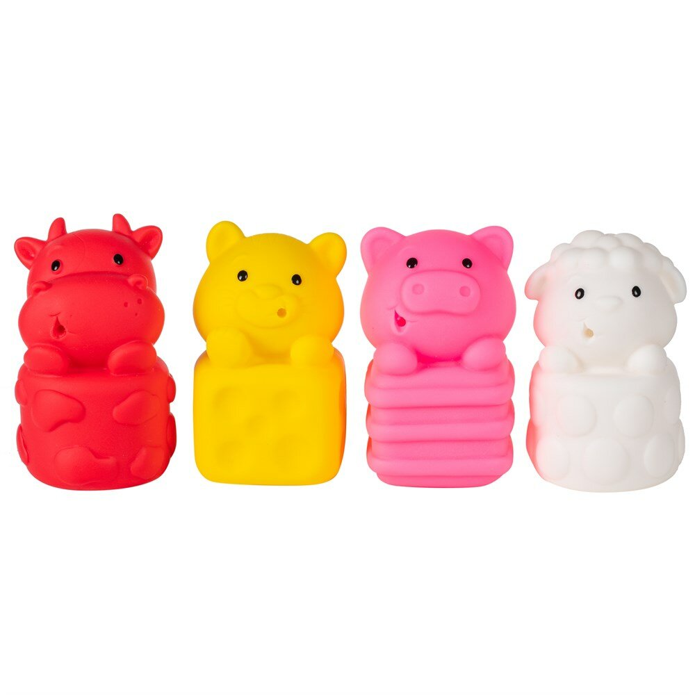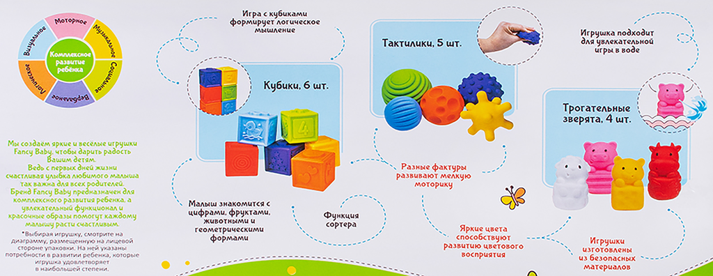 В состав входят: тактилики - 5 шт., трогательные зверята - 4 шт., кубики - 6 шт.