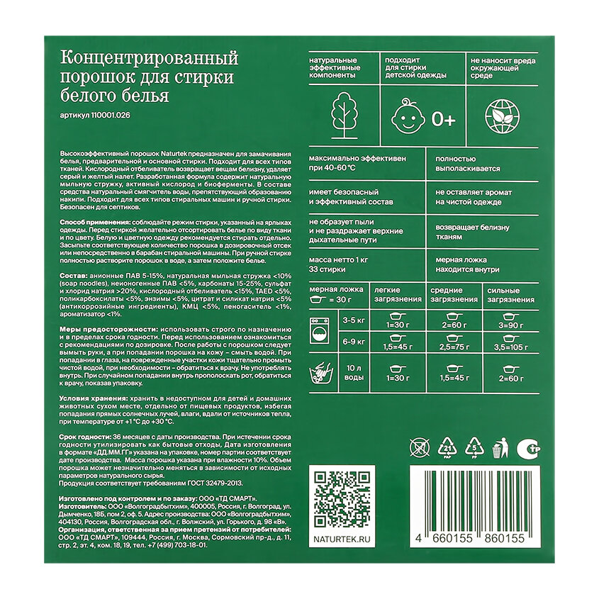 Порошок гипоаллергенный без аромата для стирки белого и цветного белья Naturtek 1 кг Концентрированный порошок для стирки белого белья 1 кг