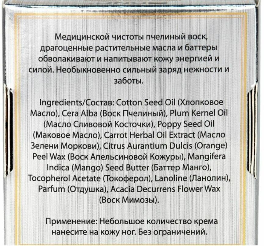 | Состав | Cotton Seed Oil (Хлопковое Масло), Cera Alba (Воск Пчелиный), Plum Kernel Oil (Масло Сливовой Косточки), Poppy Seed Oil (Маковое Масло), Carrot Herbal Oil Extract (Масло Зелени Моркови), Citrus Aurantium Dulcis (Orange) Peel Wax (Воск Апельсиновой Кожуры), Mangifera Indica (Mango) Seed Butter (Баттер Манго), Tocopherol Acetate (Токоферол), Lanoline (Ланолин), Parfum (Отдушка), Acacia Decurrens Flower Wax (Воск Мимозы). |