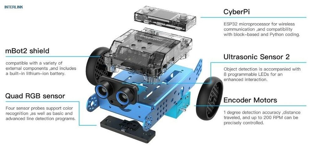 С mBot2 дети могут изучать современные компьютерные технологии, такие как Интернет вещей, Искусственный интеллект, блочное программирования и Python, в то время, когда они проектируют и собирают своих роботов.