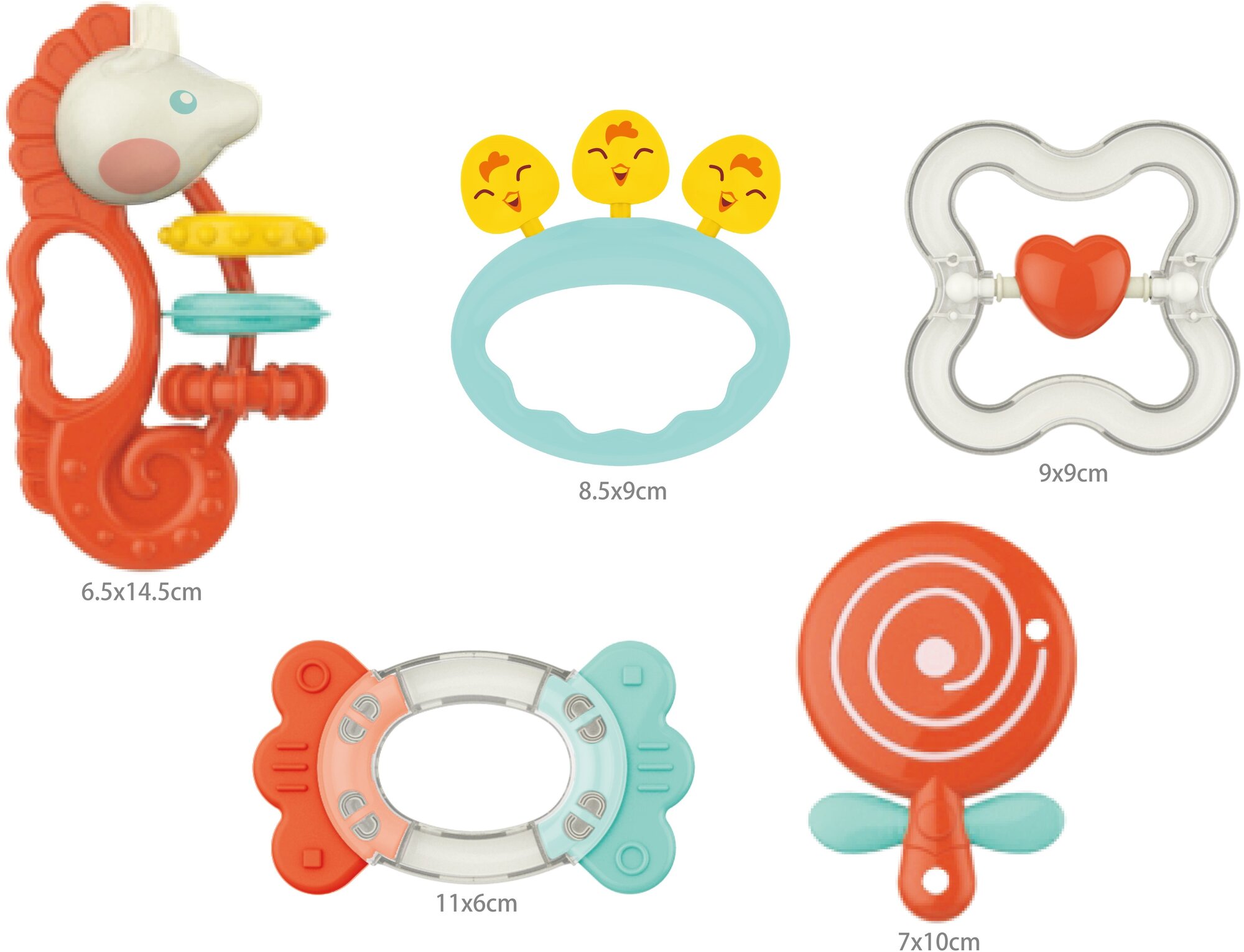 А также дополнительные гремящие, шуршащие элементы, которые отвлекают кроху от неприятных ощущений. В упаковке 5 разных Прорезывателя-Игрушки-Погремушки шириной от 45 мм до 95 мм и длиной от 95 мм до 125 мм.