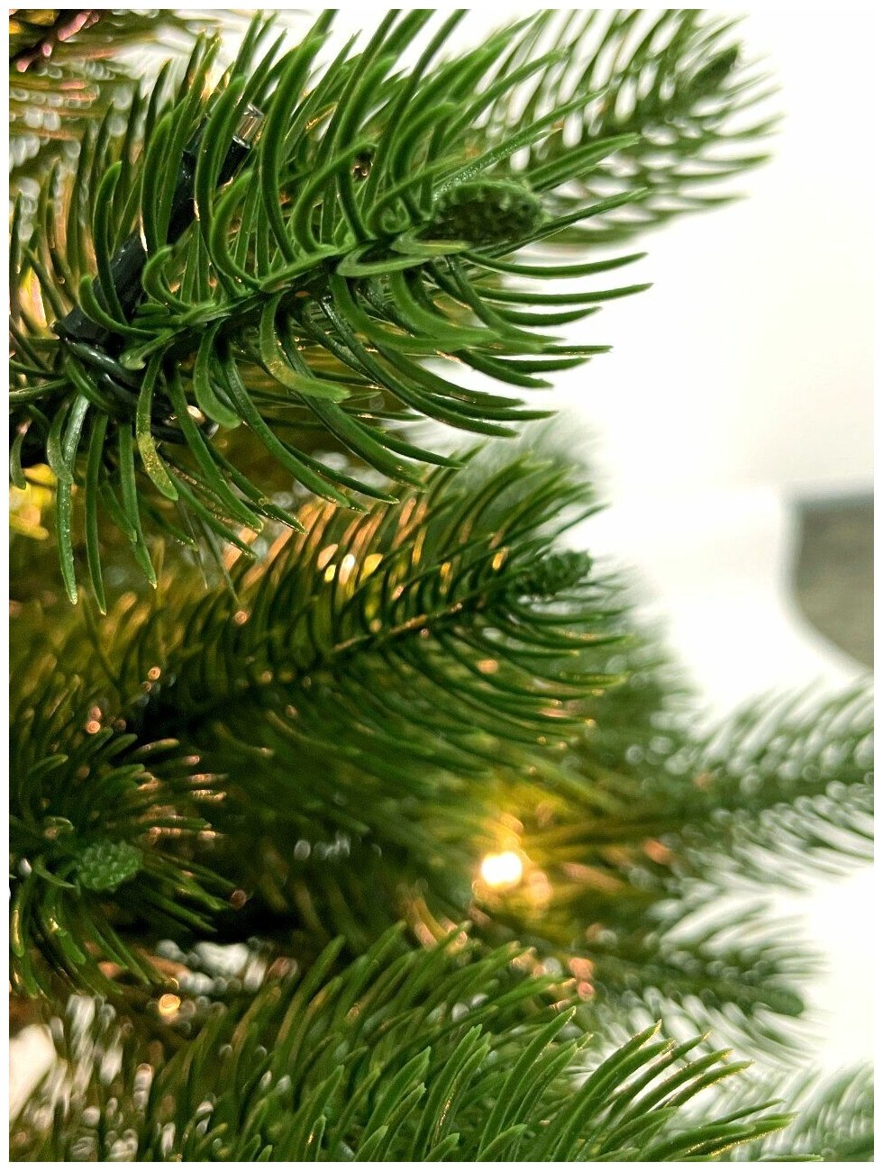 Насыщенный цветок веток и яркие прожилки делают ель невероятно богатой и объемной. модель со 100%-но литыми ветками. Ствол окутан в коричневую хвою, имитирующую кору ели, которая выполняет декоративную функцию. Гирлянда уже вплетена в деревце. Лампы LED тепло-белого цвета. 1 режим -статичный.