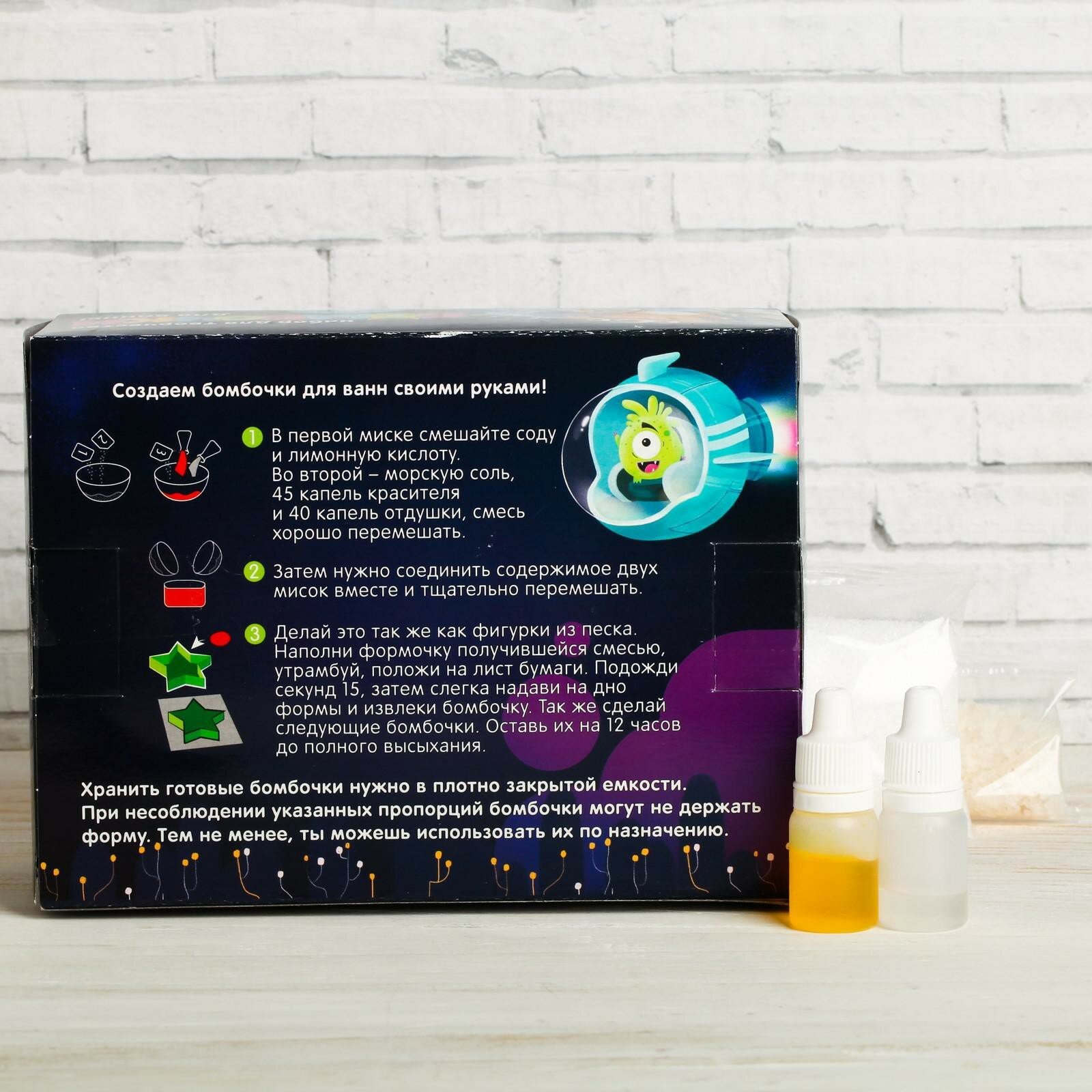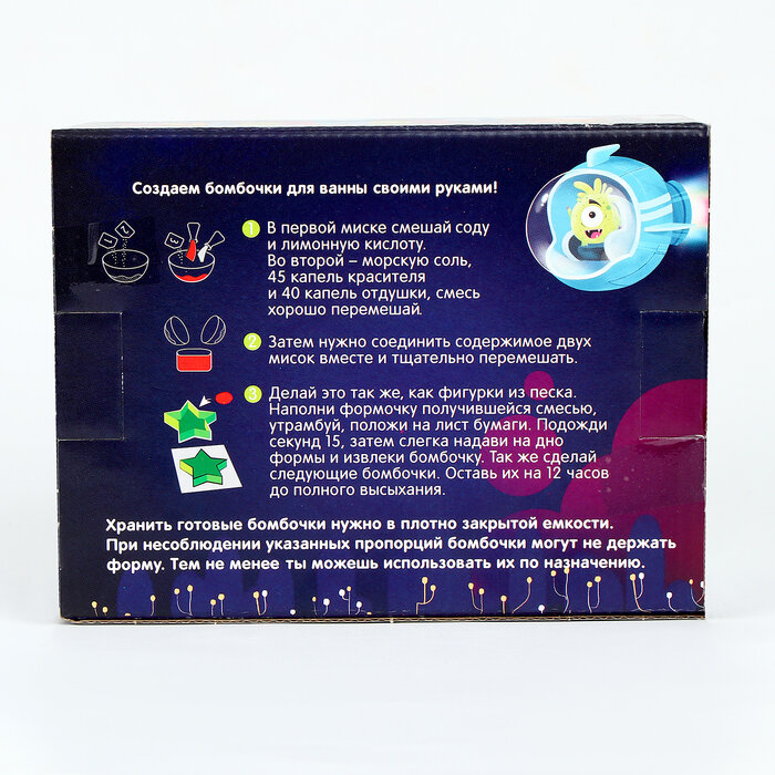 Набор для творчества создан специально для того, чтобы вы могли самостоятельно, следуя инструкции, создать бурлящие шарики для ванной! Необходимые атрибуты идут в наборе, а простая и понятная инструкция присутствует на обороте упаковки - все, что осталось сделать, так это начать маленький творческий эксперимент.
