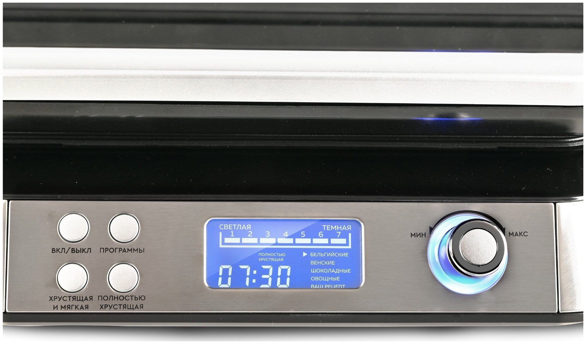 Вафельница для бельгийских вафель имеет современный русифицированный ЖК-дисплей, который отображает выбранную программу, текстуру, степень поджаривания и время до окончания процесса приготовления.