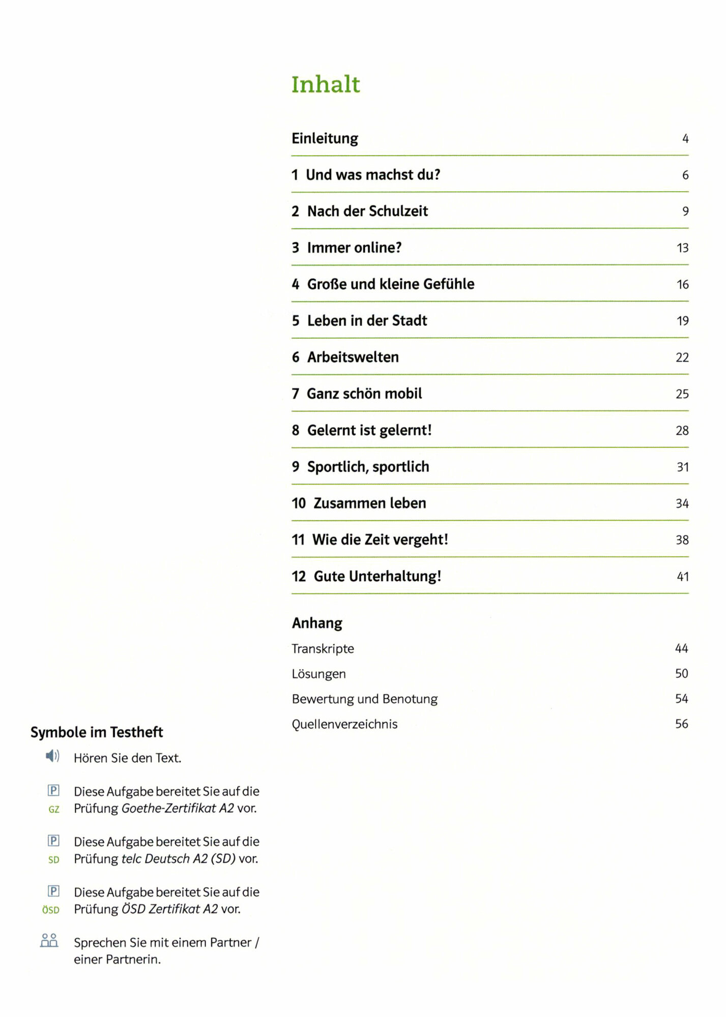 В буклете представлены тесты для отслеживания прогресса обучения для каждой главы учебника. Тренировочные или тестовые задания есть по всем четырем навыкам, также как и задания для подготовки к экзаменам (Start Deutsch 2, Goethe-Zertifikat A2 und OSD Zertifikat A2).